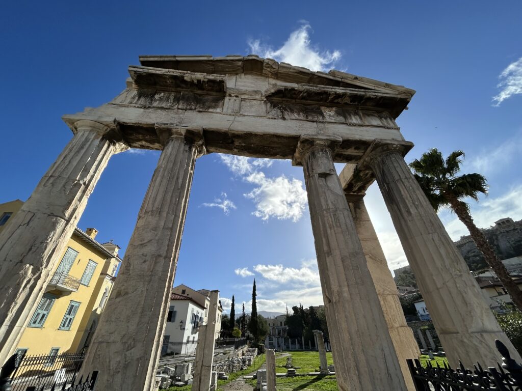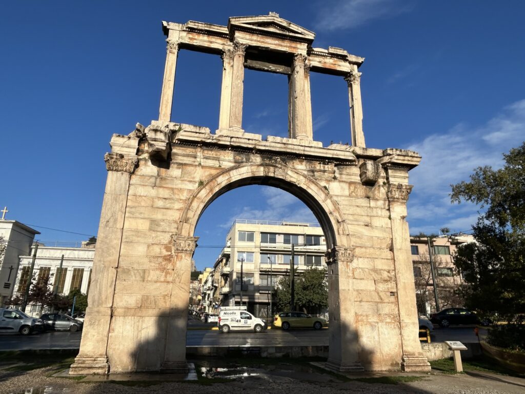 Łuk Hadriana wzniesiony w 131–132 r. n.e., najprawdopodobniej z okazji wizyty cesarza w Atenach. Monument stanął przy dawnej drodze prowadzącej ze starego miasta ku wschodniej części Aten i pełnił funkcję symbolicznej bramy. Forma łączy rzymski łuk triumfalny z elementami architektury greckiej: dolną część stanowi pojedynczy przejazd arkadowy, a górną – lekka struktura z pilastrami i trójkątnymi naczółkami. Brak reliefów bitewnych i dekoracji narracyjnych odróżnia łuk od klasycznych łuków triumfalnych imperium. Najważniejszym elementem są dwie inskrypcje, wyryte po obu stronach przejazdu. Od strony zachodniej widniał napis: „To są Ateny, dawne miasto Tezeusza”, od wschodniej: „To jest miasto Hadriana, a nie Tezeusza”.