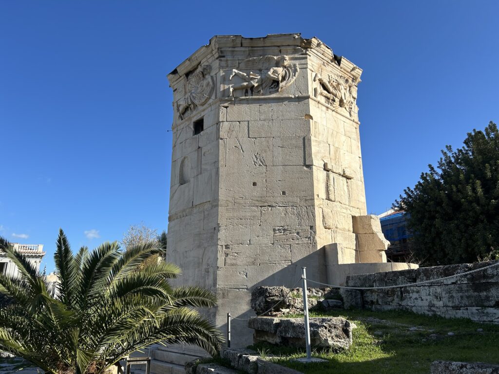 Wieża Wiatrów jest najlepiej zachowanym obiektem Agory Rzymskiej. Została wzniesiona w I w. p.n.e. przez Andronikosa z Kyrrhos jako ośmioboczna wieża meteorologiczna i czasomierz. Każda z elewacji odpowiadała jednemu z ośmiu wiatrów, przedstawionych w formie reliefów u szczytu budowli. Obiekt łączył kilka funkcji: na zewnątrz działały zegary słoneczne, wewnątrz znajdował się zegar wodny (klepsydra), a całość zwieńczona była obrotowym wskaźnikiem kierunku wiatru. W okresie bizantyńskim i osmańskim wieża była wykorzystywana wtórnie, m.in. jako kaplica i miejsce zgromadzeń religijnych, co przyczyniło się do jej dobrego stanu zachowania.