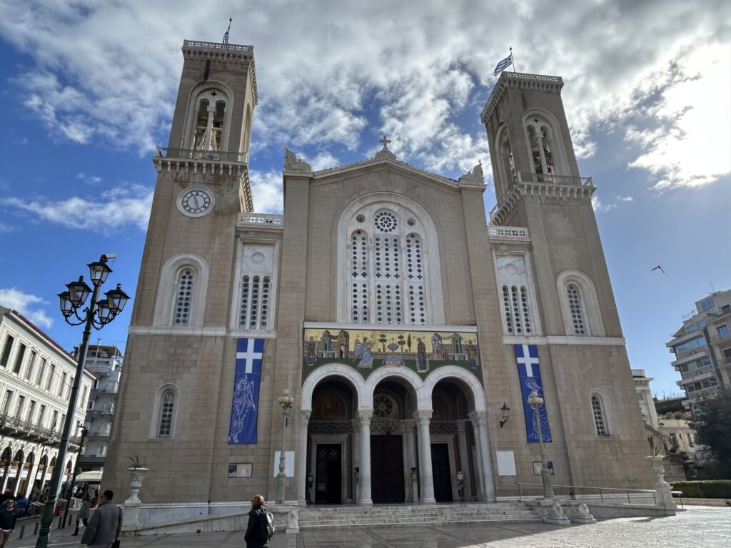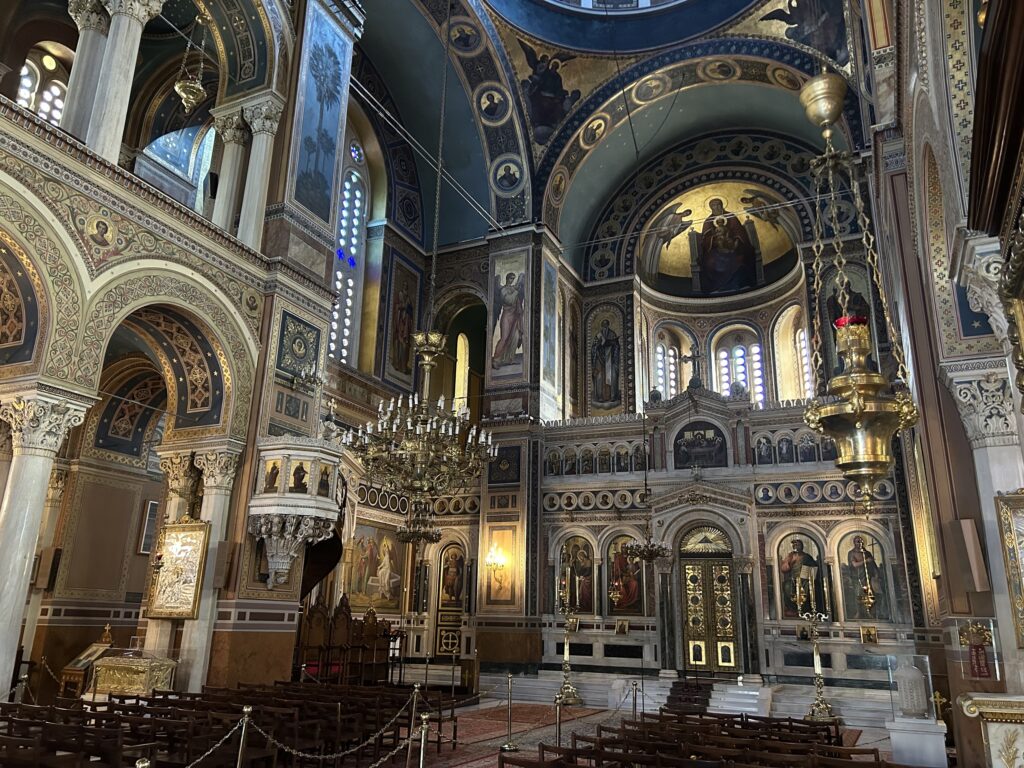 Wielka Katedra Ateńska (Mitropolis) jest główną świątynią Greckiego Kościoła Prawosławnego i siedzibą arcybiskupa Aten. Została wzniesiona w latach 1842–1862, w pierwszych dekadach istnienia nowożytnego państwa greckiego. Budowę realizowano etapami, korzystając m.in. ze spoliów – elementów architektonicznych pochodzących z około 70 rozebranych kościołów bizantyjskich i wczesnonowożytnych z terenu Aten i Attyki. Architektonicznie świątynia reprezentuje historyzujący monumentalizm XIX wieku, łączący schemat bazylikowo-kopułowy z elementami neobizantyjskimi. Fasada z dwiema masywnymi wieżami ma charakter zachodni, niespotykany w klasycznym budownictwie bizantyjskim, i wyraźnie nawiązuje do ówczesnych europejskich katedr.