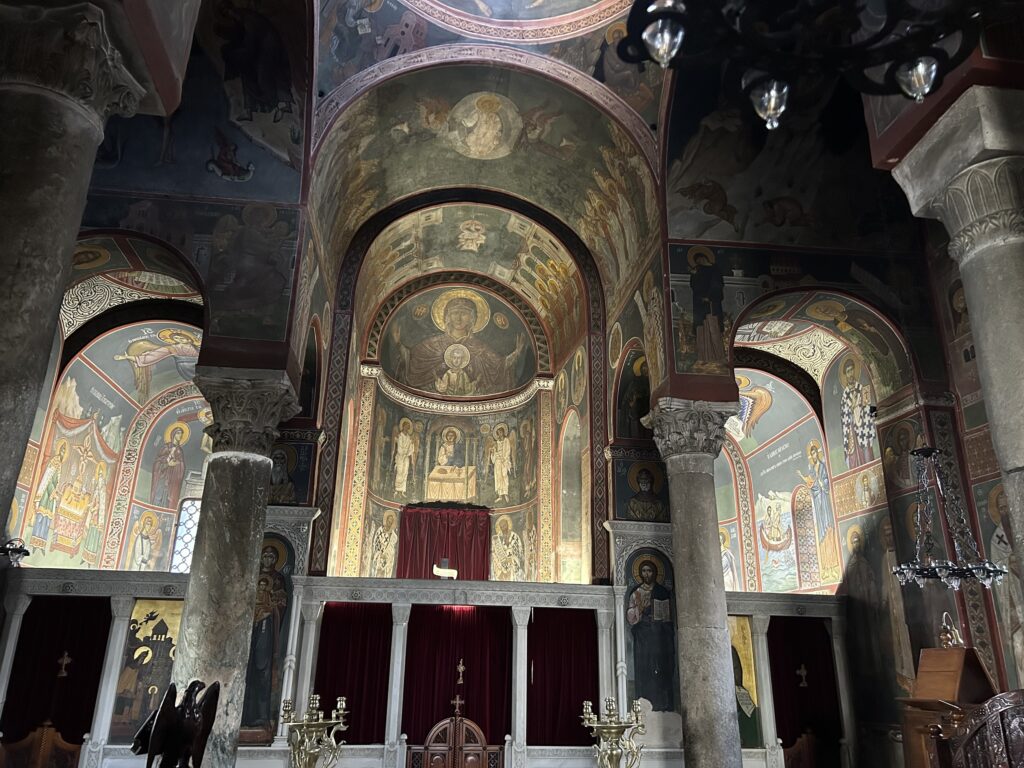 Wnętrze wspiera się na czterech antycznych kolumnach z kapitelami wtórnie wykorzystanymi, co nadaje przestrzeni wyraźnie wertykalny charakter. Zachowany program malarski pochodzi w znacznej mierze z XX wieku i został wykonany przez Fotisa Kontoglou, jednego z najważniejszych twórców nowogreckiej odnowy ikonograficznej, nawiązującej do kanonu bizantyjskiego. Starsze fragmenty dekoracji zachowały się jedynie szczątkowo. W XIX w., podczas przebudowy miasta po ogłoszeniu niepodległości, rozważano rozbiórkę kościoła w celu poszerzenia arterii handlowej. Ostatecznie świątynia została ocalona dzięki interwencji Kościoła i środowisk naukowych.