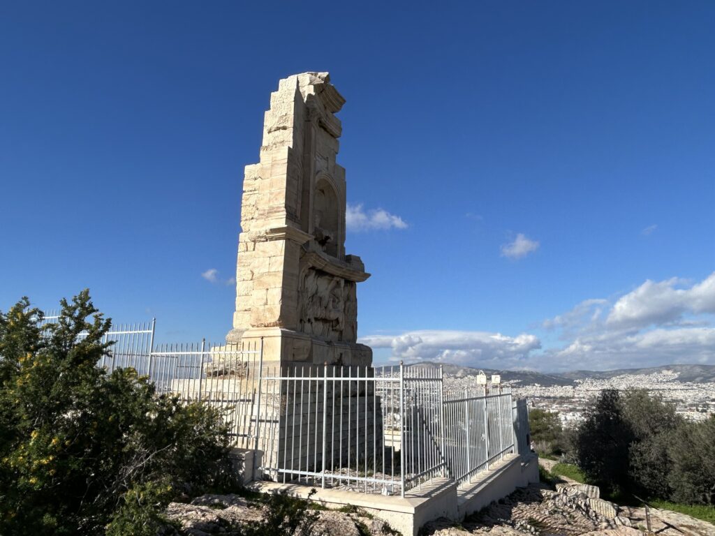 Pomnik Filopapposa znajduje się na Wzgórzu Muz, został wzniesiony ok. 114–116 r. n.e. ku czci Gajusza Juliusza Antiocha Filopapposa, arystokraty pochodzenia syryjsko-kommagenejskiego i obywatela Aten. Monument miał charakter grobowca heroicznego o formie wielokondygnacyjnej fasady, łączącej tradycję hellenistyczną z rzymską architekturą reprezentacyjną. Zachowane reliefy i inskrypcje podkreślały zarówno rzymskie godności Filopapposa, jak i jego związek z Atenami. Usytuowanie na wyniosłym grzbiecie wzgórza zapewniało czytelność pomnika w panoramie miasta i wpisywało go w program monumentalizacji Aten w epoce cesarskiej.