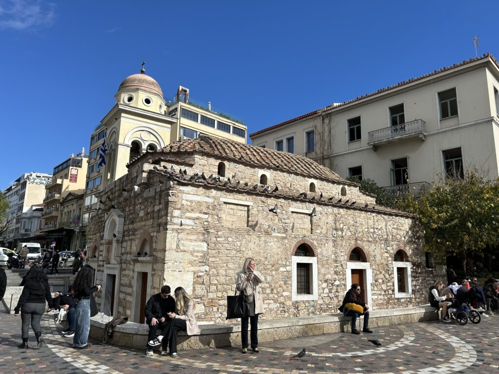 Istotną rolę pełnią miejskie place. Plac Monastiraki jest jednym z najstarszych miejsc, w którym nakładają się na siebie niemal wszystkie epoki miasta. Jego nazwa pochodzi od niewielkiego klasztoru Panagia Pantanassa, zachowanego do dziś na wschodniej pierzei placu; już w czasach osmańskich okolica pełniła funkcję handlową i targową, związaną z ruchem przybyszów i tranzytem towarów. Plac leży na styku starożytnej agory, rzymskiego forum i nowożytnego śródmieścia – nowoczesna infrastruktura dosłownie przecina warstwy archeologiczne, czyniąc historię elementem codziennego krajobrazu. Plac funkcjonuje jako węzeł miejski: punkt przesiadkowy, miejsce spotkań, brama prowadząca na Plakę, do Anafiotiki i w stronę Akropolu.