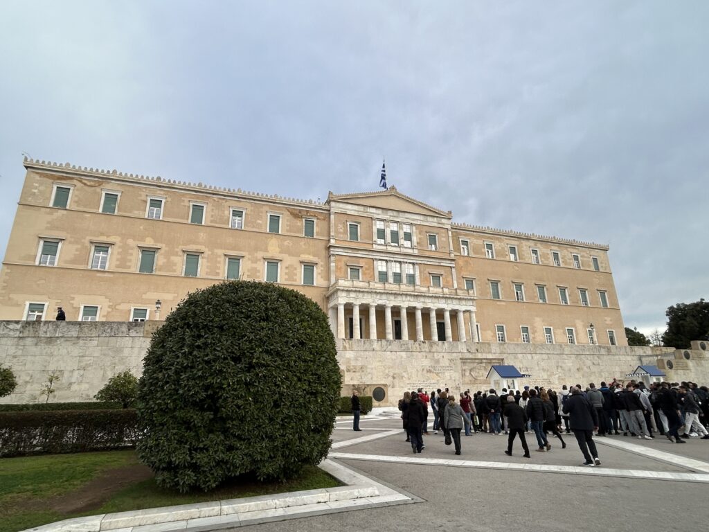 U podnóża fasady znajduje się Grób Nieznanego Żołnierza (odsłonięty w 1932 r.), upamiętniający poległych Greków bezimiennie we wszystkich wojnach nowożytnego państwa. Centralna płaskorzeźba przedstawia martwego hoplitę stylizowanego na wojownika klasycznego, a na murach po obu stronach wykuto nazwy bitew – od wojen bałkańskich, przez I i II wojnę światową, po konflikty XX wieku. Stałą wartę przy grobie pełni Gwardia Prezydencka (Evzones), której ceremonialna zmiana warty jest elementem rytuału państwowego. Strój evzonów – fustanella, tsarouchia oraz czerwone nakrycie głowy typu farió – odwołuje się do tradycji walk o niepodległość z XIX w., ceremoniał opiera się na ściśle określonym protokole wojskowym.