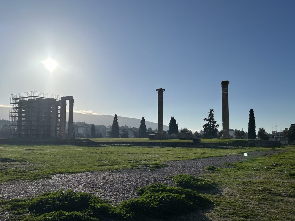Świątynia Zeusa Olimpijskiego (Olympiejon) była największą budowlą sakralną starożytnych Aten. Jej początki sięgają VI w. p.n.e., czasów tyranii Pizystratydów, jednak budowę wielokrotnie przerywano i wznawiano, aż do ostatecznego ukończenia w 131 r. n.e. za panowania cesarza Hadriana. Z inicjatywy władcy w celli, obok posągu Zeusa, ustawiono także jego własny wizerunek, nieco mniejszy od figury bóstwa. Monumentalna świątynia, zaprojektowana w porządku korynckim, liczyła pierwotnie 104 kolumny; do naszych czasów zachowało się jedynie 16. Pozostałe kamienne bloki były w kolejnych stuleciach (zwłaszcza w okresie późnoantycznym i bizantyjskim) wykorzystywane jako materiał budowlany, m.in. przy wznoszeniu pobliskich kościołów.