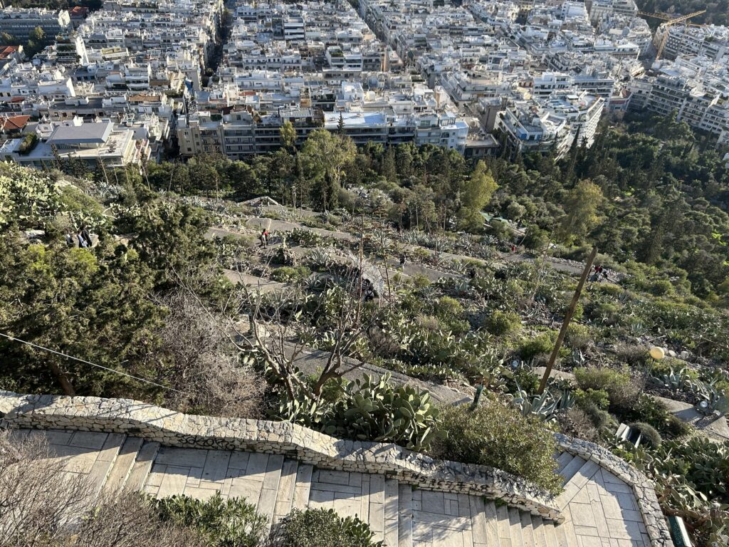 Wzgórze Likawitos jest z kolei najwyższym naturalnym wzniesieniem w centrum miasta (277 m) i jednym z kluczowych punktów orientacyjnych. Podejście prowadzi systemem utwardzonych ścieżek i kamiennych stopni poprowadzonych po stromym, wapiennym zboczu. Trasa wykorzystuje naturalną rzeźbę terenu, wynikającą z budowy geologicznej wzgórza (wapienie i dolomity Attyki). Roślinność ma charakter śródziemnomorski: dominują sosny, cyprysy i niska makia, w dużej części wprowadzona w XIX i XX w. w ramach planowego zalesiania wzgórza. Likawitos od początku istnienia nowożytnych Aten pełni funkcję rekreacyjną i widokową.