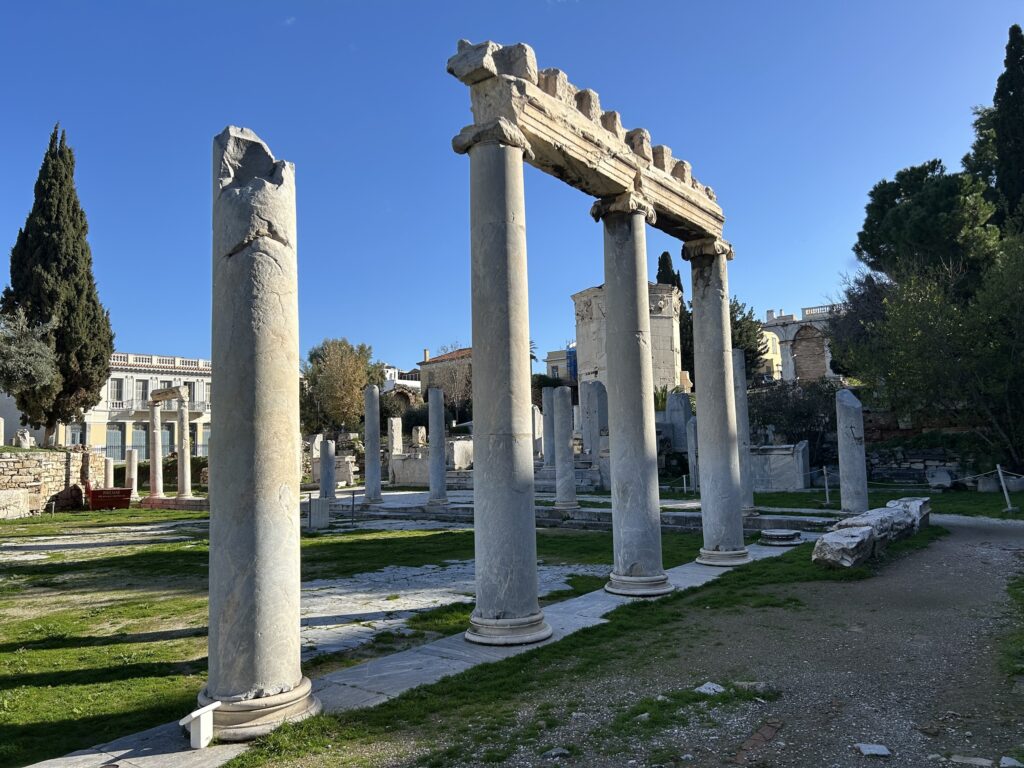 Ruch pieszy dominuje nad kołowym, a kluczowe osie — Ermou, Mitropoleos, Adrianou — funkcjonują jak miejskie korytarze tranzytowe, łączące strefy historyczne z obszarami handlowymi i komunikacyjnymi. To przestrzeń, w której obok antycznych ruin występują XIX-wieczne gmachy państwowe, powojenna zabudowa mieszkaniowa oraz nowoczesna infrastruktura XXI w., tworząc gęstą, wielowarstwową tkankę miasta.
