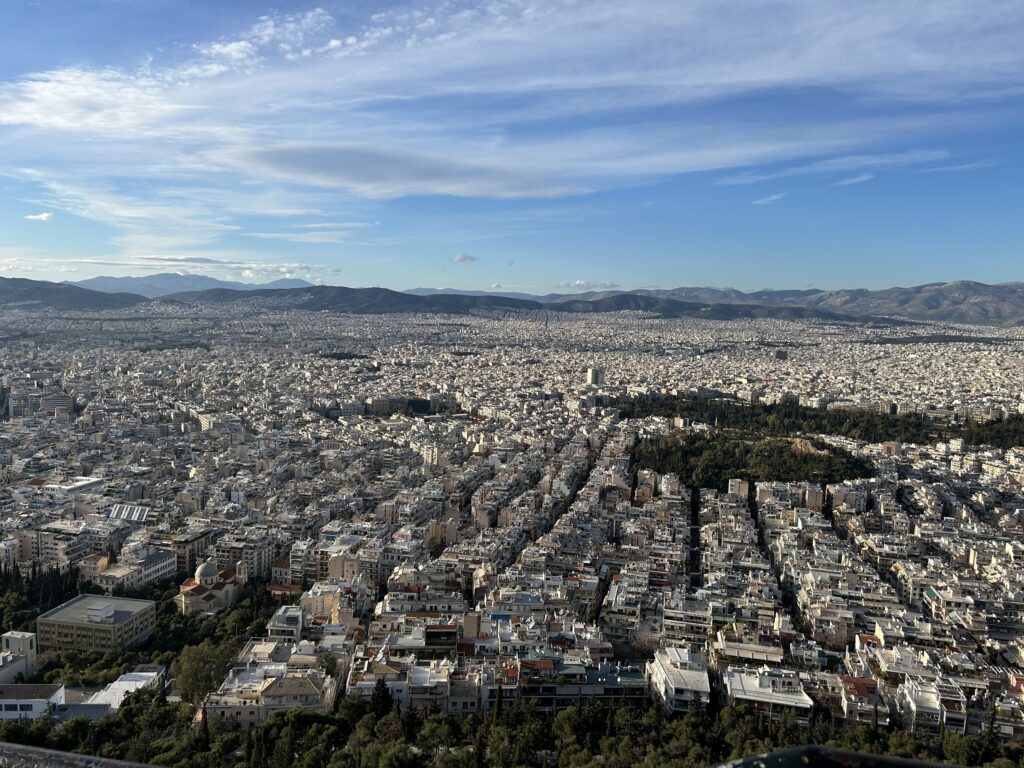Widok z Likawitosu domyka trasę syntetycznym obrazem Aten jako organizmu historycznego i przestrzennego. Układ miasta ujawnia się jako gęsta, niemal jednolita tkanka niskiej zabudowy, przecięta osiami komunikacyjnymi i ograniczona pasmem Hymetu na wschodzie i masywem Egaleo na zachodzie. Łączy starożytne zabytki, osmańską zabudowę, XIX-wieczne instytucje państwowe i współczesną metropolię – obszar metropolitalny Aten–Pireusu (Attyka) liczy ok. 3,7–3,8 mln mieszkańców.