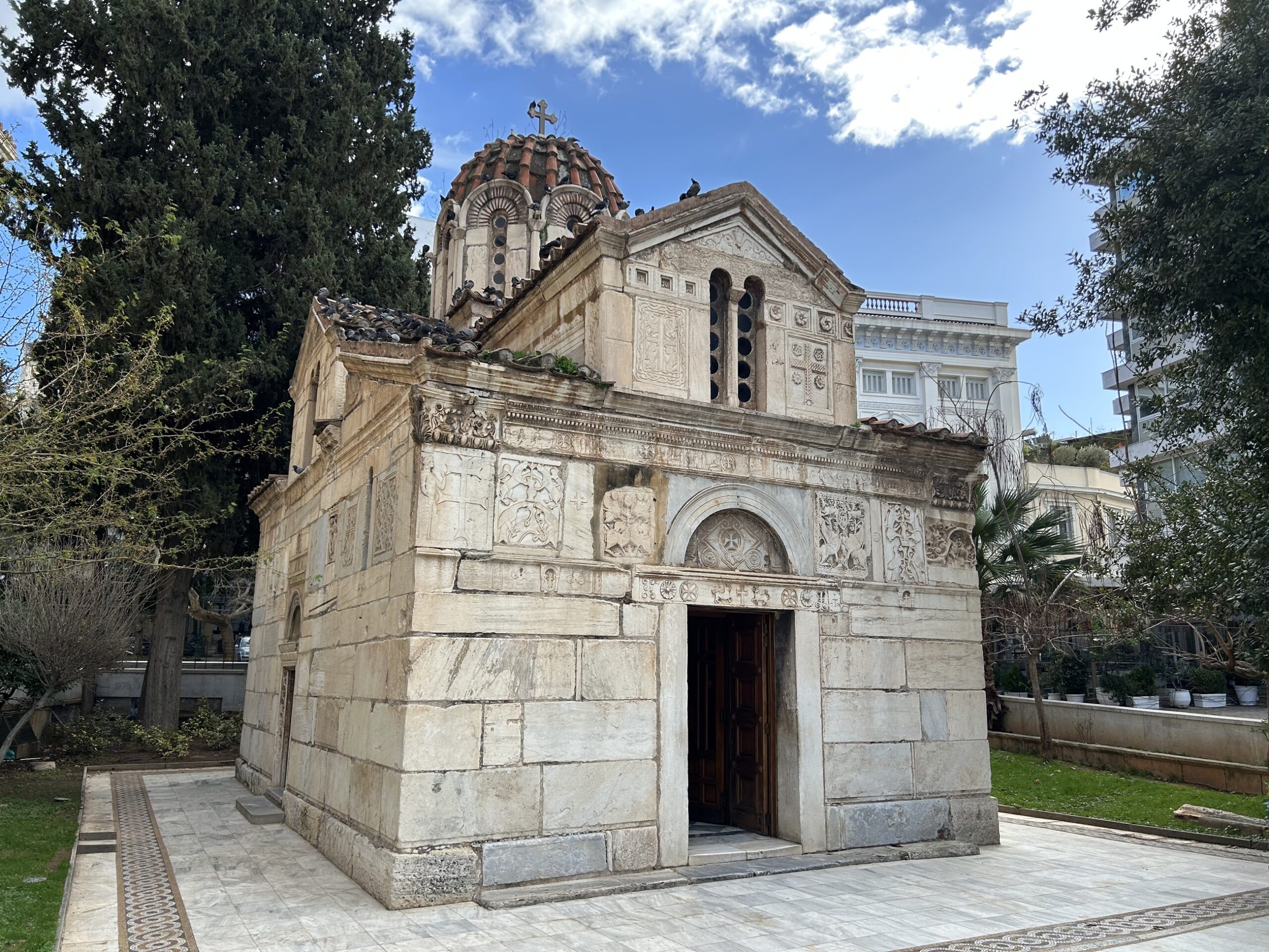 Mała Katedra Ateńska (Panagia Gorgoepikoos vel Agios Eleftherios) jest jednym z najcenniejszych średniobizantyjskich kościołów Aten, wzniesionym w XII w. tuż obok Wielkiej Katedry. W przeciwieństwie do XIX-wiecznej Mitropolis reprezentuje autentyczną architekturę bizantyjską okresu komnenowskiego. Świątynia ma niewielkie rozmiary i plan krzyżowo-kopułowy, typowy dla ateńskich kościołów średniobizantyjskich. Jej wyjątkowość polega na niemal całkowitym wykorzystaniu spoliów antycznych i wczesnochrześcijańskich. Ściany zewnętrzne zbudowano z bloków marmuru pochodzących z budowli starożytnych, reliefów nagrobnych, fragmentów architektonicznych i inskrypcji. Dekoracja rzeźbiarska elewacji — fryzy, płyty reliefowe i detale geometryczne — stanowi jedno z najbogatszych świadectw wtórnego użycia materiału w Bizancjum ateńskim.