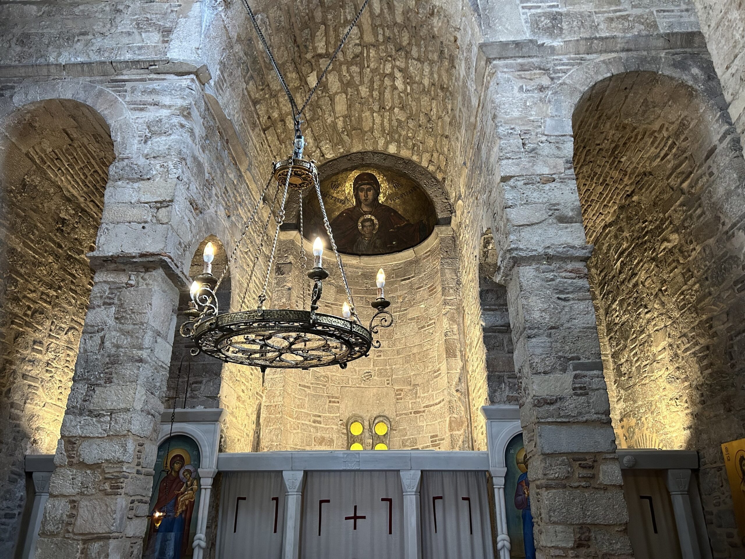Mniej szczęścia miał kościół św. Katarzyny (Agia Aikaterini), pierwotnie dedykowany św. Teodorowi. Bryła pochodzi z XI w., jednak obecny kształt jest efektem wielofazowej rozbudowy, obejmującej późny okres bizantyjski i czasy osmańskie. Świątynia łączy elementy krzyżowo-kopułowe z rozbudowanym narteksem i obejściami. Dodatki zatarły bizantyjski charakter kościoła, a stare freski przemalowano pod koniec XIX w.