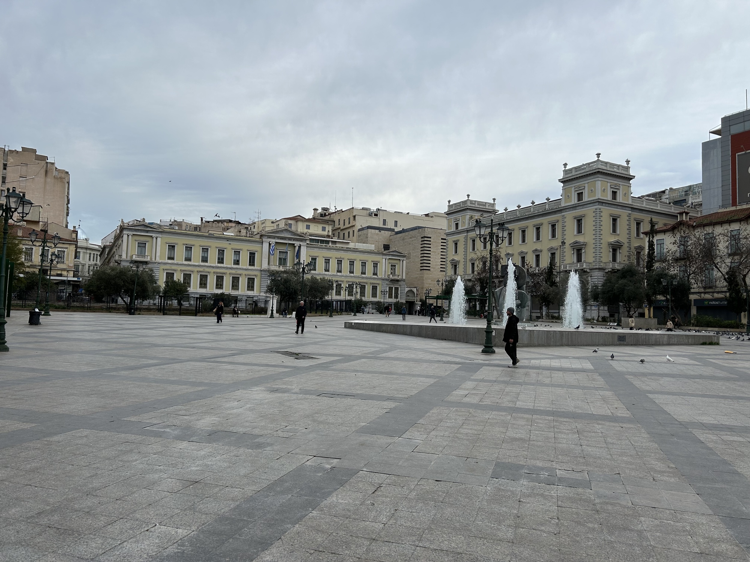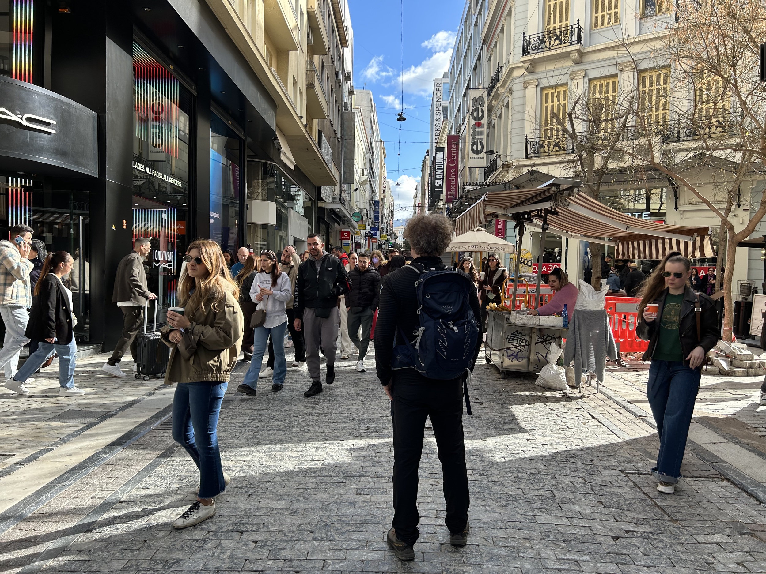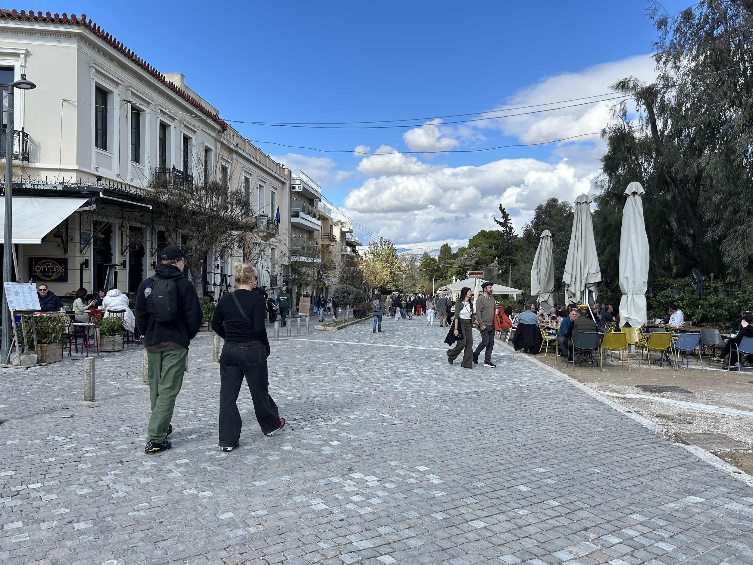 Ruch pieszy dominuje nad kołowym, a kluczowe osie — Ermou, Mitropoleos, Adrianou — funkcjonują jak miejskie korytarze tranzytowe, łączące strefy historyczne z obszarami handlowymi i komunikacyjnymi. To przestrzeń, w której obok antycznych ruin występują XIX-wieczne gmachy państwowe, powojenna zabudowa mieszkaniowa oraz nowoczesna infrastruktura XXI w., tworząc gęstą, wielowarstwową tkankę miasta.