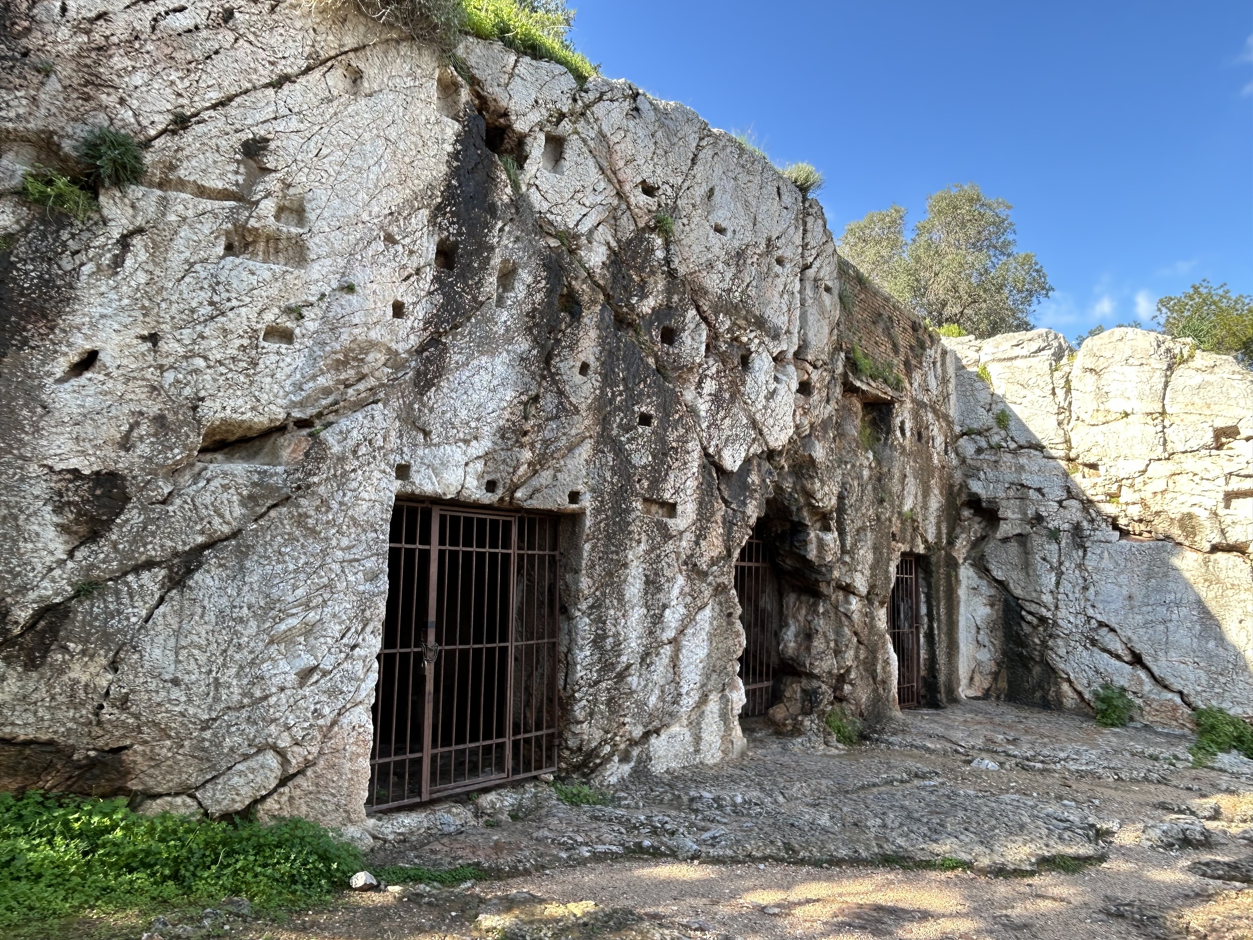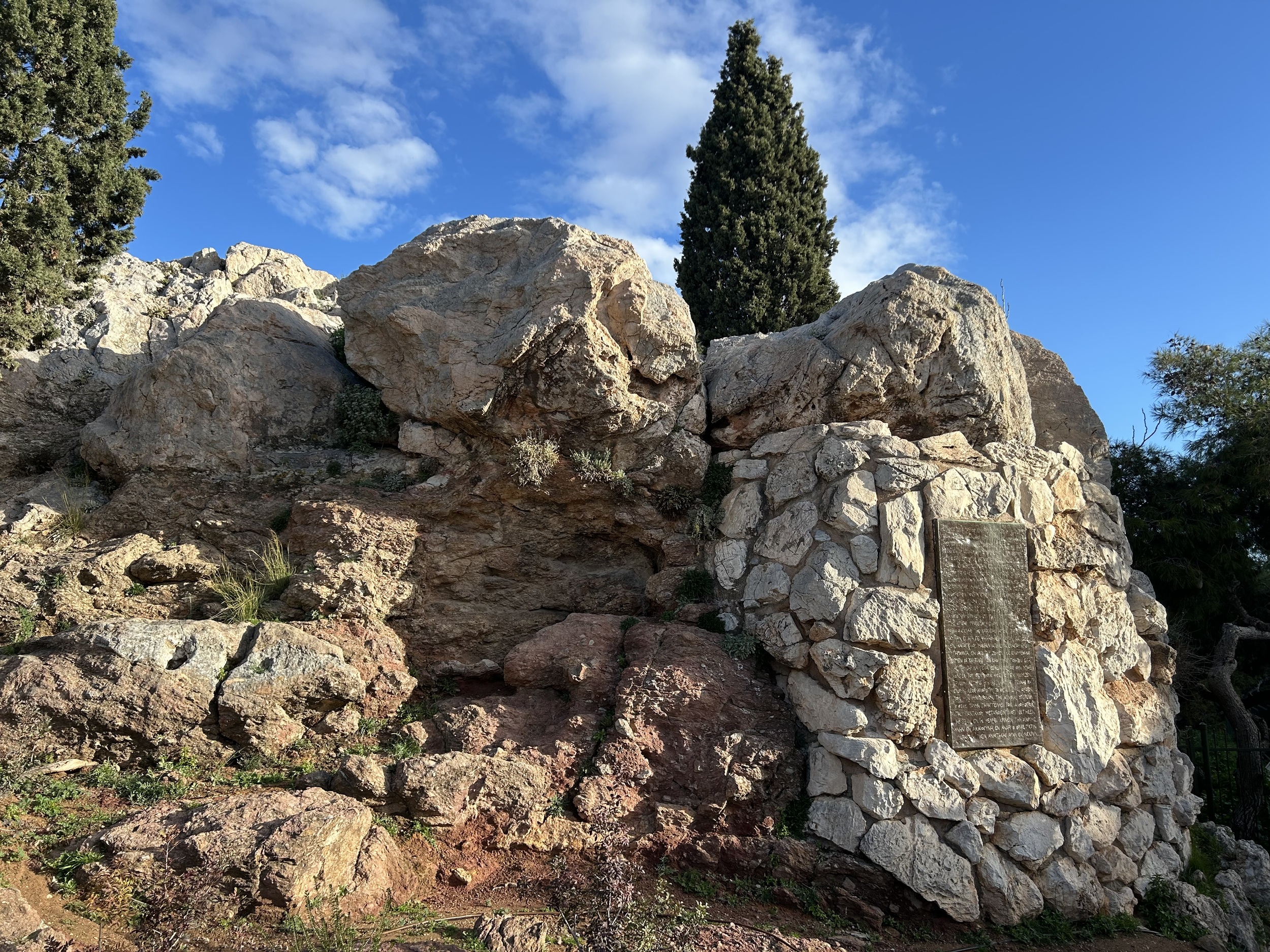 Nieopodal zespół wykutych w skale pomieszczeń jest tradycyjnie identyfikowany jako miejsce uwięzienia Sokratesa przed wykonaniem wyroku w 399 r. p.n.e. Miejsce funkcjonuje w świadomości Aten jako punkt pamięci związany symbolicznie z postacią wielkiego filozofa. Interpretacja ta pojawiła się dopiero w czasach nowożytnych i nie jest potwierdzona źródłowo ani archeologicznie. Nie zachowały się inskrypcje, brak jest jednoznacznych danych stratygraficznych, a źródła antyczne nie zawierają opisów topograficznych pozwalających na taką identyfikację.