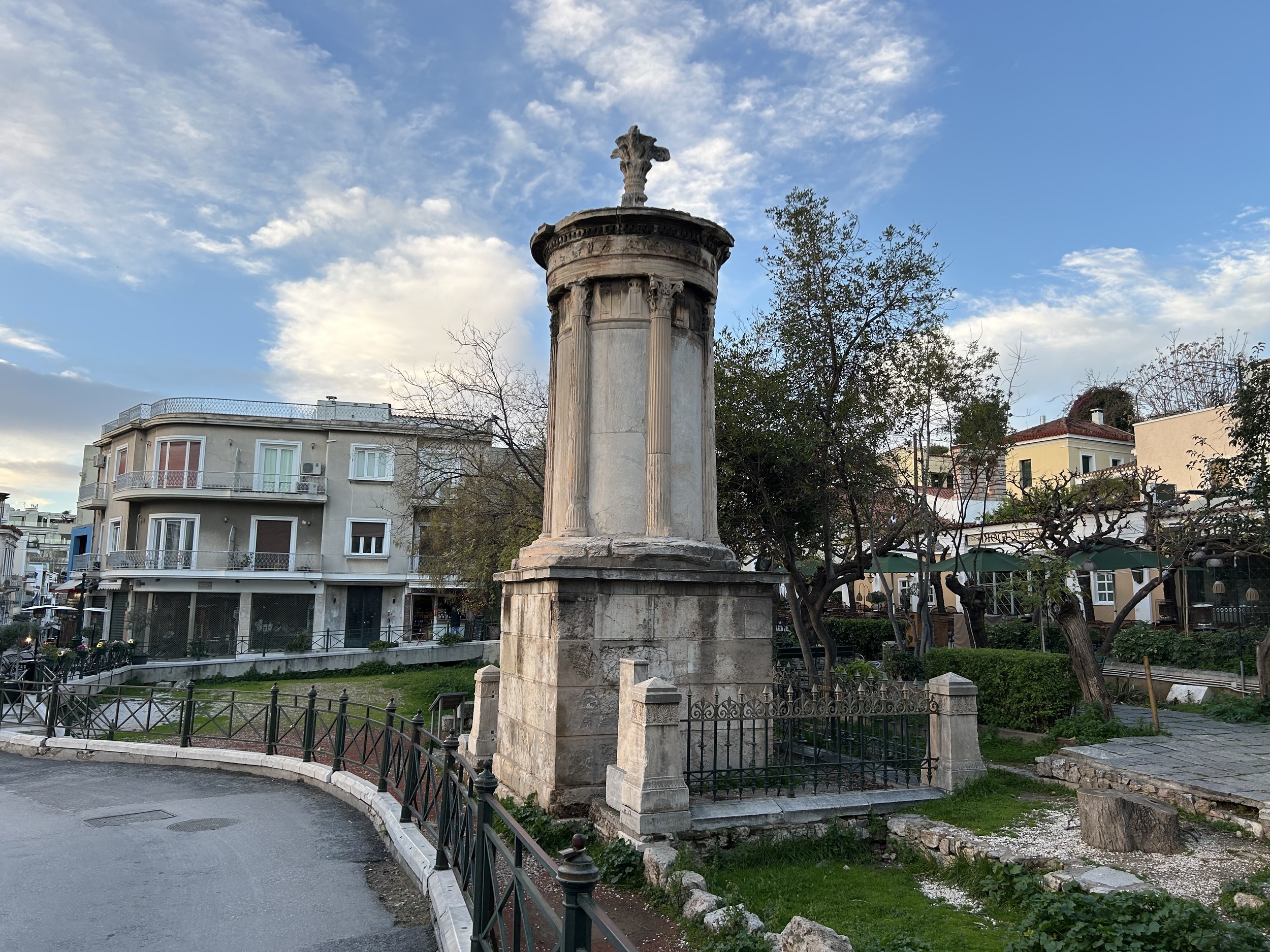 Pomnik Lizykratesa został wzniesiony w 334 r. p.n.e. przez Lizykratesa, chorega (fundatora) zwycięskiego chóru w agonach dramatycznych podczas Dionizjów. Monument jest najlepiej zachowanym przykładem pomnika stawianego przez sponsorów przedstawień teatralnych. Cylindryczna forma z kolumnami korynckimi i fryzem przedstawiającym mit o Dionizosie i piratach odzwierciedla przejście Aten ku bogatszym, późnoklasycznym formom dekoracji. Pomnik pierwotnie wieńczył trójnóg – nagrodę teatralną, a jego lokalizacja wyznaczała dawną „ulicę trójnogów” (Tripodon), skupiającą podobne monumenty fundatorów.