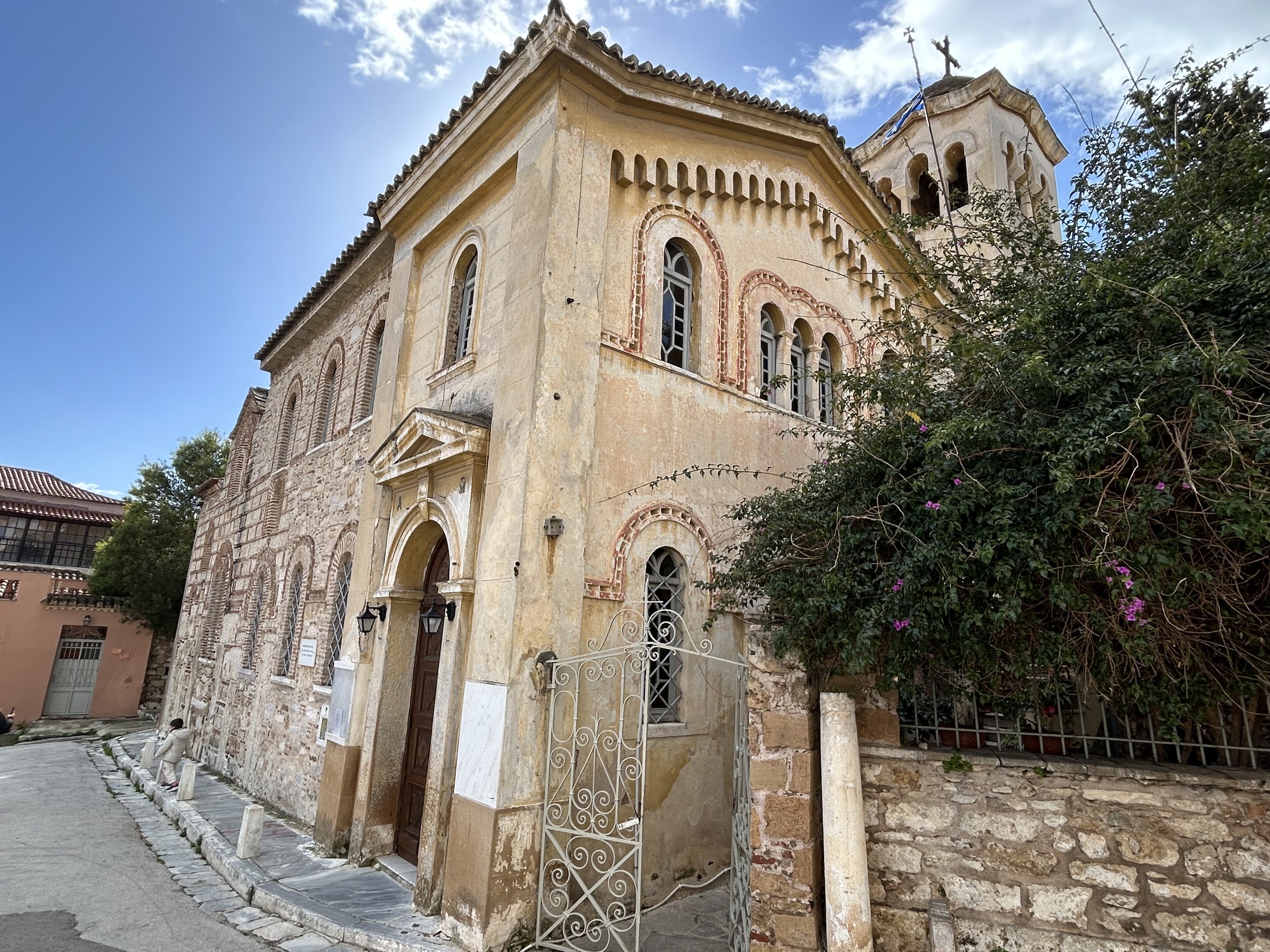 Kościół Przemienienia Pańskiego (Agia Metamorfosi tou Sotiros) należy do grupy ateńskich świątyń o średniobizantyjskim rodowodzie, których dzisiejsza forma również jest efektem XIX-wiecznych przekształceń po zniszczeniach greckiej wojny o niepodległość (1821-1830). Oryginalna budowla powstała najpewniej w XI–XII w., natomiast obecna, symetryczna bryła z dwiema dzwonnicami i uproszczoną elewacją odpowiada estetyce neobizantyjskiej epoki odbudowy nowożytnego państwa greckiego. Z pierwotnej budowli zachowały się jedynie trzy absydy i sklepienia ponad nimi.