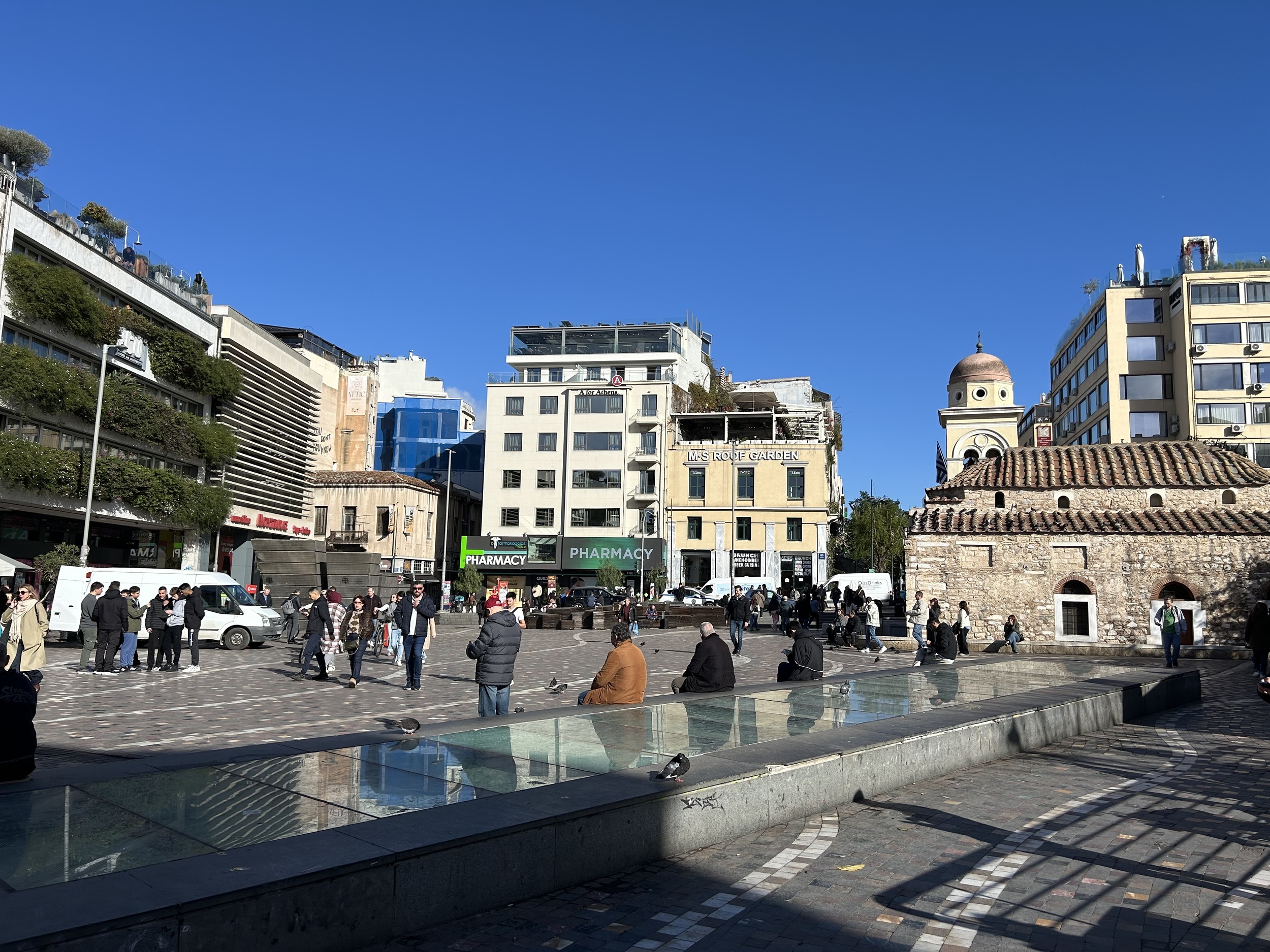 Istotną rolę pełnią miejskie place. Plac Monastiraki jest jednym z najstarszych miejsc, w którym nakładają się na siebie niemal wszystkie epoki miasta. Jego nazwa pochodzi od niewielkiego klasztoru Panagia Pantanassa, zachowanego do dziś na wschodniej pierzei placu; już w czasach osmańskich okolica pełniła funkcję handlową i targową, związaną z ruchem przybyszów i tranzytem towarów. Plac leży na styku starożytnej agory, rzymskiego forum i nowożytnego śródmieścia – nowoczesna infrastruktura dosłownie przecina warstwy archeologiczne, czyniąc historię elementem codziennego krajobrazu. Plac funkcjonuje jako węzeł miejski: punkt przesiadkowy, miejsce spotkań, brama prowadząca na Plakę, do Anafiotiki i w stronę Akropolu.