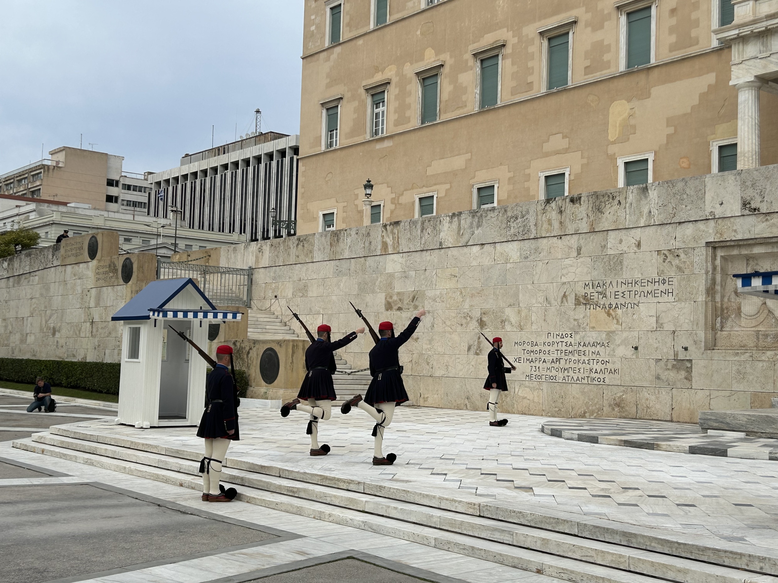 U podnóża fasady znajduje się Grób Nieznanego Żołnierza (odsłonięty w 1932 r.), upamiętniający poległych Greków bezimiennie we wszystkich wojnach nowożytnego państwa. Centralna płaskorzeźba przedstawia martwego hoplitę stylizowanego na wojownika klasycznego, a na murach po obu stronach wykuto nazwy bitew – od wojen bałkańskich, przez I i II wojnę światową, po konflikty XX wieku. Stałą wartę przy grobie pełni Gwardia Prezydencka (Evzones), której ceremonialna zmiana warty jest elementem rytuału państwowego. Strój evzonów – fustanella, tsarouchia oraz czerwone nakrycie głowy typu farió – odwołuje się do tradycji walk o niepodległość z XIX w., ceremoniał opiera się na ściśle określonym protokole wojskowym.