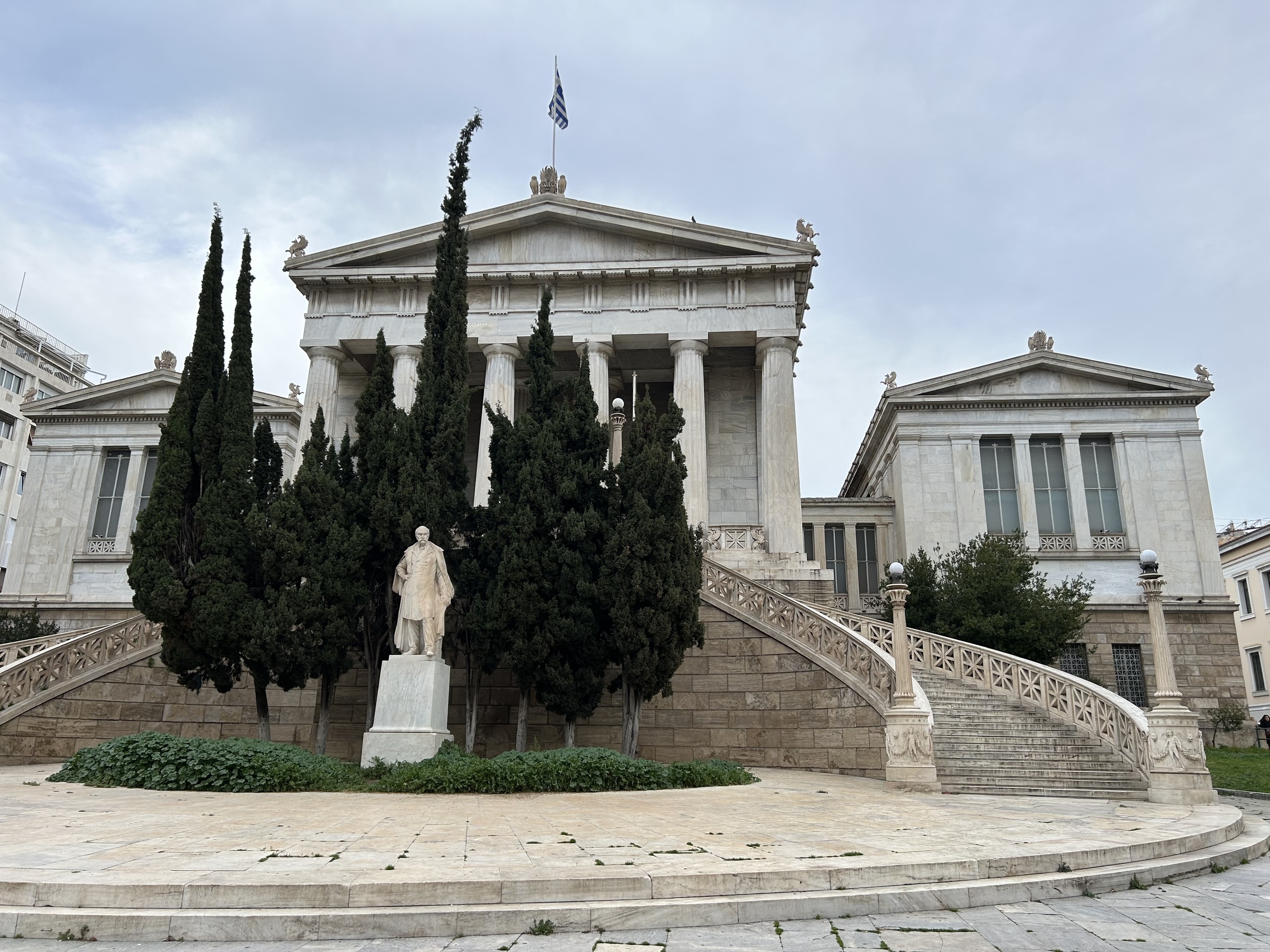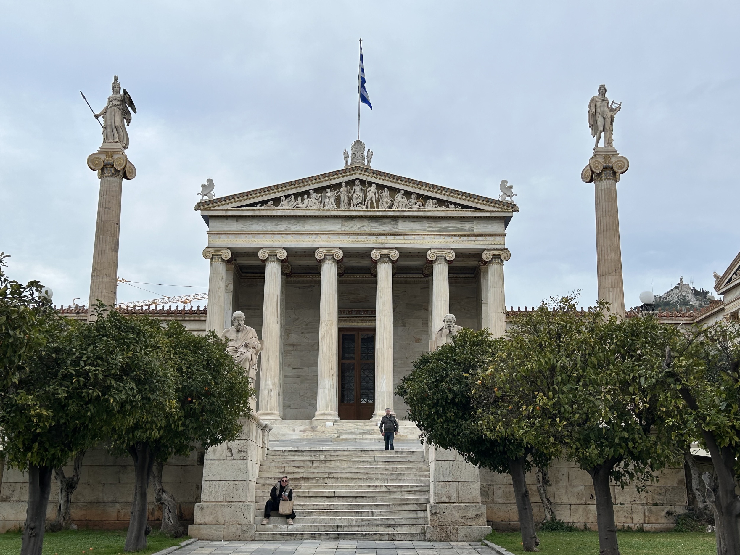Ostatnim elementem tryptyku ateńskiego jest Akademia Ateńska, wzniesiona w latach 1859–1885 jako instytucjonalne i wizualne nawiązanie do starożytnej tradycji filozoficznej, przede wszystkim do Akademii Platona. W odróżnieniu od Biblioteki (magazynu wiedzy) i Uniwersytetu (miejsca jej przekazywania), Akademia miała uosabiać refleksję, autorytet i ciągłość intelektualną. Przed fasadą stoją wykonane przez Leonidasa Drosisa kolumny z posągami Ateny i Apollina — personifikacji rozumu, sztuki i harmonii — a na schodach zasiadają Platon i Sokrates, wpisując nowożytną Grecję w antyczną genealogię myśli.