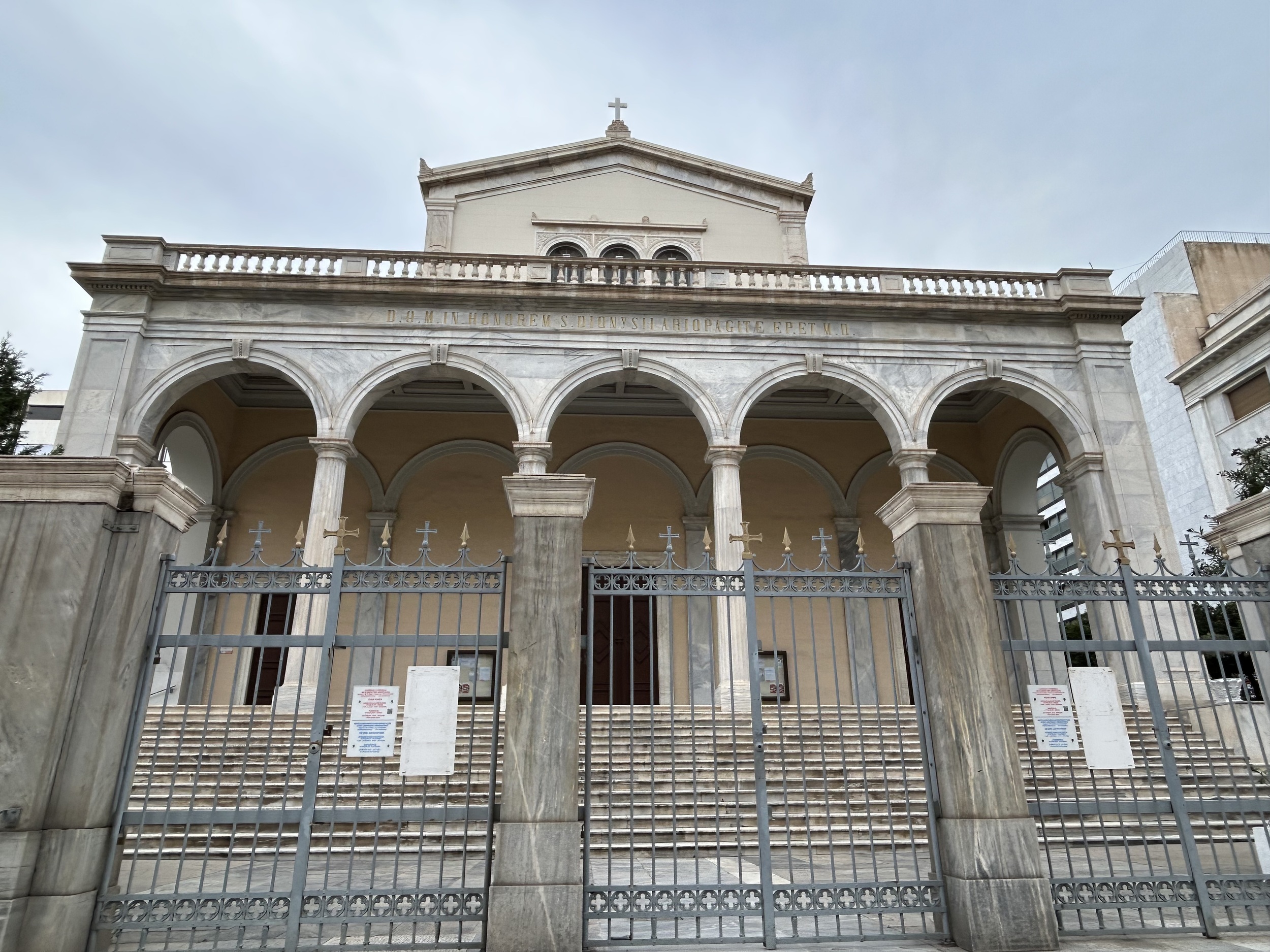 Katedra św. Dionizego Areopagity jest najważniejszą świątynią rzymskokatolicką w Atenach i siedzibą arcybiskupa. Wzniesiono ją w latach 1853–1865 według projektu Leo von Klenzego, architekta związanego z monachijskim dworem Wittelsbachów. W 1943 r. katedra została poważnie uszkodzona podczas bombardowania Aten przez niemieckie Luftwaffe. Odbudowę przeprowadzono po wojnie, zachowując pierwotny układ i charakter architektoniczny.