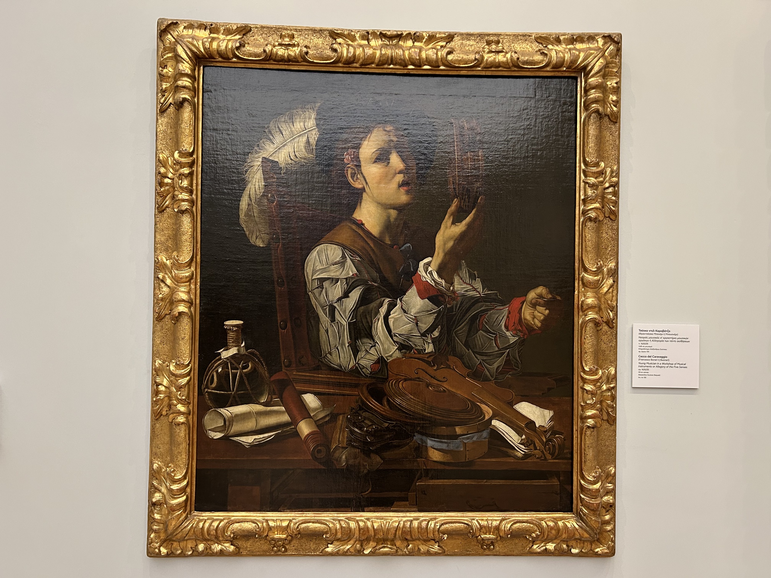 W zbiorach jest także obraz Cecco del Caravaggio (Francesco Boneri), jednego z najbliższych uczniów i naśladowców Caravaggia. Dzieło, datowane na ok. 1620–1625, ukazuje młodego muzyka w pracowni lutniczej i bywa interpretowane jako alegoria pięciu zmysłów — motyw popularny w sztuce baroku. Silny kontrast światła i cienia (chiaroscuro), naturalizm modelunku oraz niemal teatralne skupienie postaci zdradzają bezpośrednie oddziaływanie Caravaggia. Obraz trafił do Grecji jako część kolekcji Aleksandrosa Soutzosa, która stała się jednym z fundamentów Galerii Narodowej i świadectwem XIX-wiecznych aspiracji Greków do włączenia się w główny nurt europejskiej historii sztuki.
