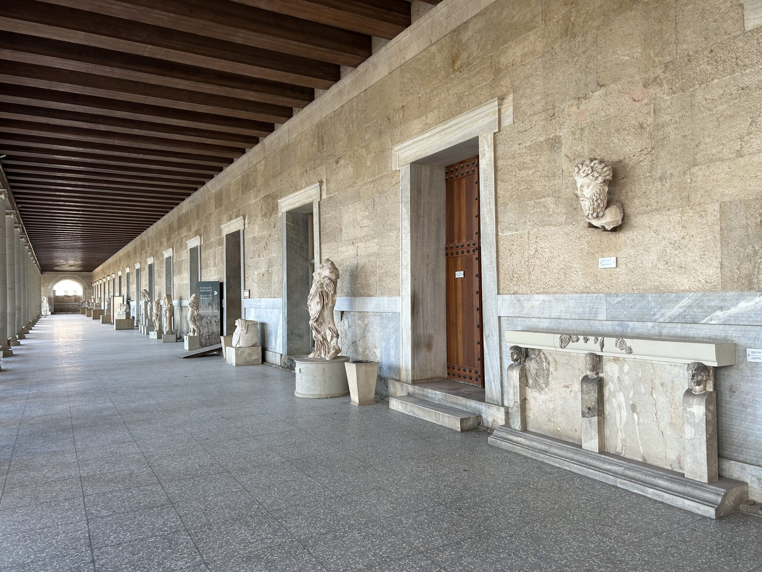 Stoa Attalosa została wzniesiona w II w. p.n.e. (ok. 150–138 p.n.e.) jako dar króla Pergamonu Attalosa II dla Aten. Budowla stanęła po wschodniej stronie Agory Ateńskiej i pełniła funkcję reprezentacyjnej stoa handlowo-administracyjnej, łączącej przestrzeń publiczną z zapleczem usługowym. Jej fundacja była elementem hellenistycznej polityki mecenatu, w której władcy Pergamonu wzmacniali swoje wpływy poprzez finansowanie monumentalnych obiektów w miastach greckich. Stoa miała formę dwukondygnacyjnej hali kolumnowej o długości ok. 116 m i szerokości ok. 20 m. Na parterze zastosowano porządek dorycki, na piętrze joński; za kolumnadami rozmieszczono łącznie 42 pomieszczenia, wykorzystywane głównie jako sklepy i pomieszczenia administracyjno-handlowe.