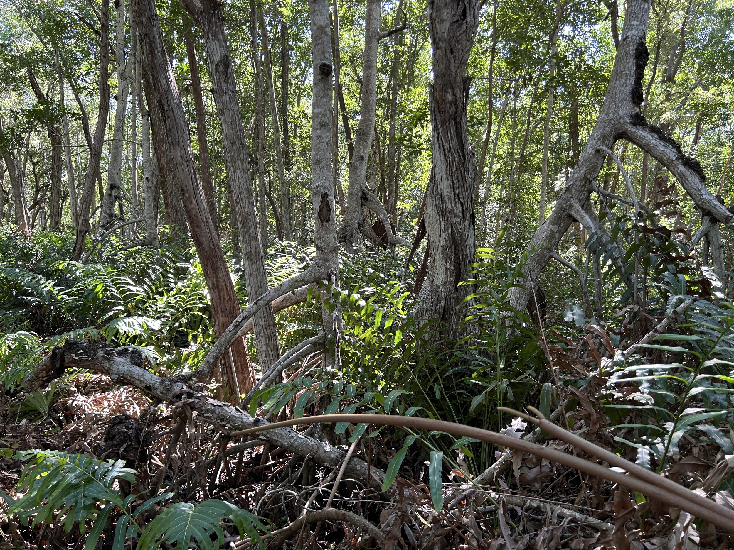 Dalej w głąb lądu pojawia się Laguncularia racemosa (mangrowiec biały), tolerujący większe wahania zasolenia i pełniący funkcję strefy przejściowej między mokradłami a lądem. Najbardziej lądowym elementem zespołu jest Conocarpus erectus (buttonwood), często traktowany jako gatunek towarzyszący mangrowcom, stabilizujący obrzeża ekosystemu.