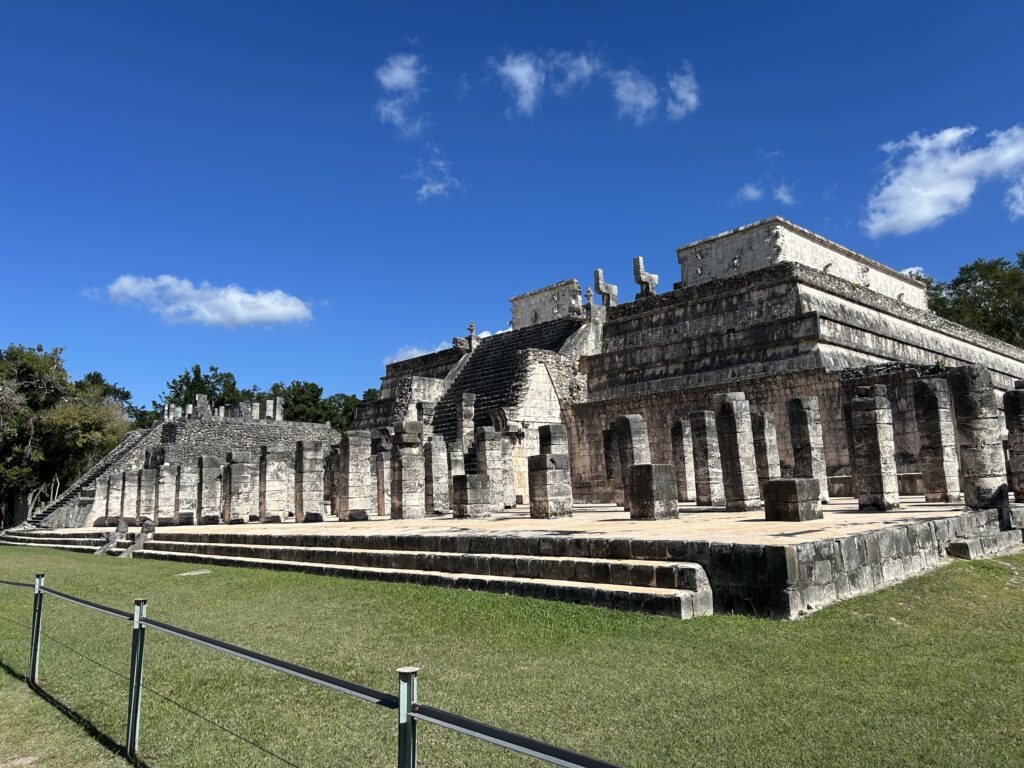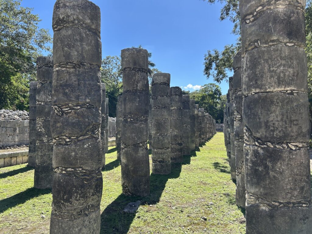 Obok rozciąga się rozległy Dziedziniec Tysiąca Kolumn (Grupo de las Mil Columnas) – las kamiennych filarów, które pierwotnie podtrzymywały lekkie zadaszenia z drewna i palmowych liści. Kolumny były rozmieszczone w regularnych modułach, co umożliwiało elastyczne kształtowanie przestrzeni w zależności od charakteru zgromadzeń i ceremonii. Przestrzeń nie była świątynią w ścisłym sensie, lecz wielofunkcyjnym centrum ceremonialno-publicznym: miejscem zgromadzeń, rytuałów, parad wojskowych oraz kontroli dostępu do najważniejszych stref sakralnych. Regularny rytm kolumn, ich masywność i skala dziedzińca podkreślają zbiorowy, niemal „instytucjonalny” charakter władzy w Chichén Itzá. To architektura podporządkowana nie jednostce, lecz strukturze — elicie wojowników i kapłanów, działających w imieniu porządku kosmicznego i politycznego. Dziedziniec stanowi czytelny kontrast wobec wcześniejszych, bardziej kameralnych przestrzeni klasycznych miast Majów, pokazując kierunek ewolucji miasta ku formie quasi-imperialnej.
