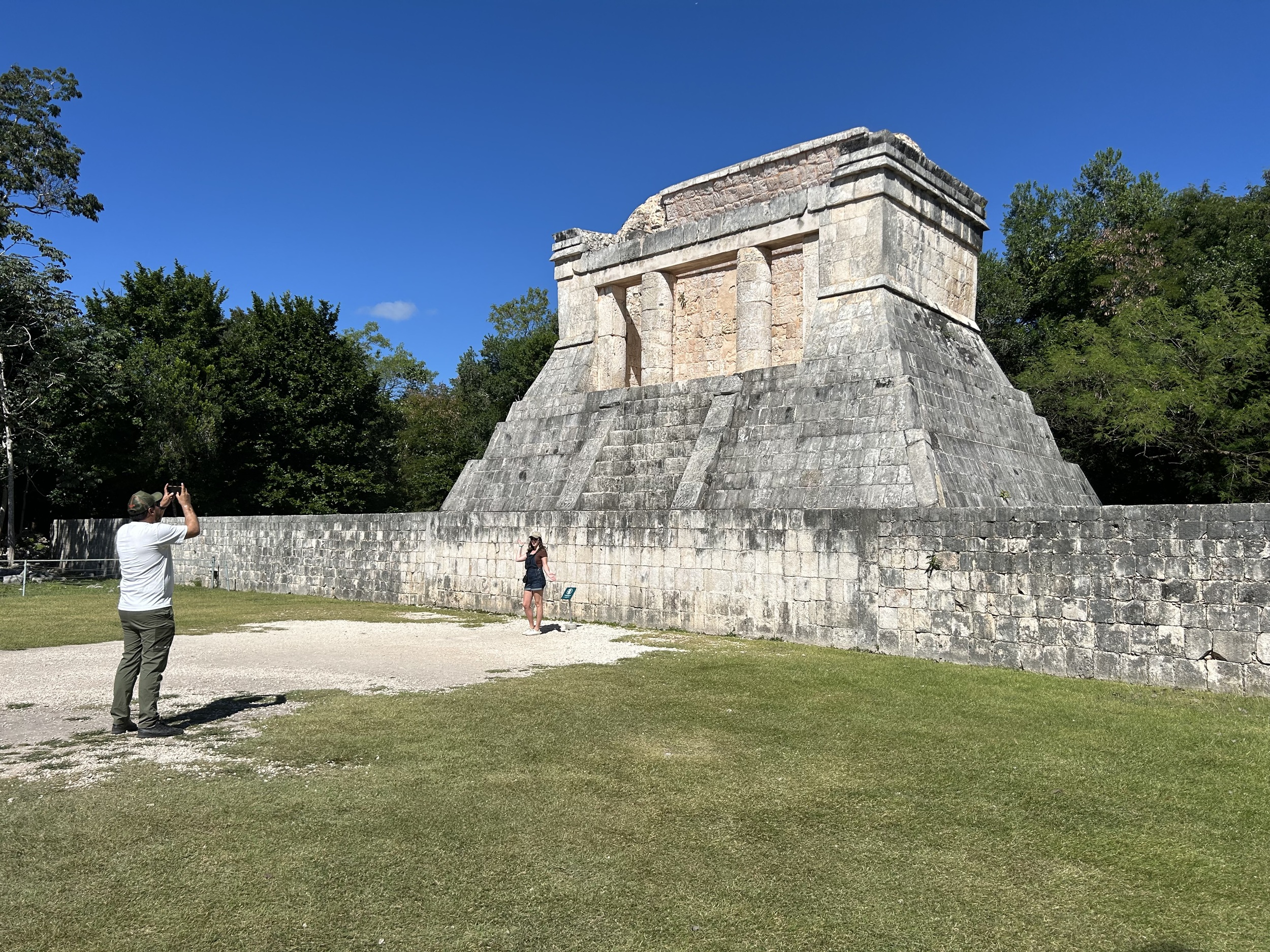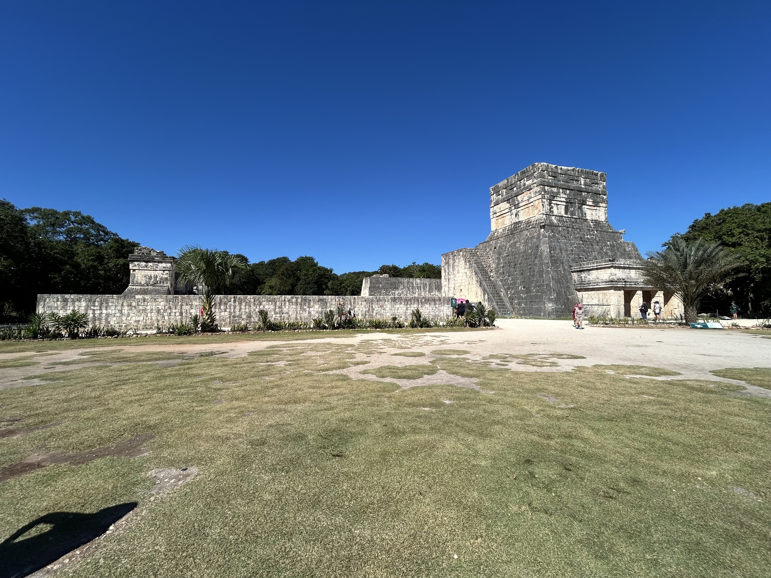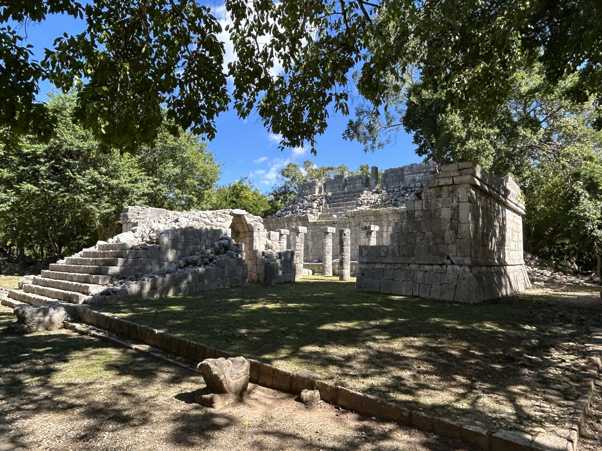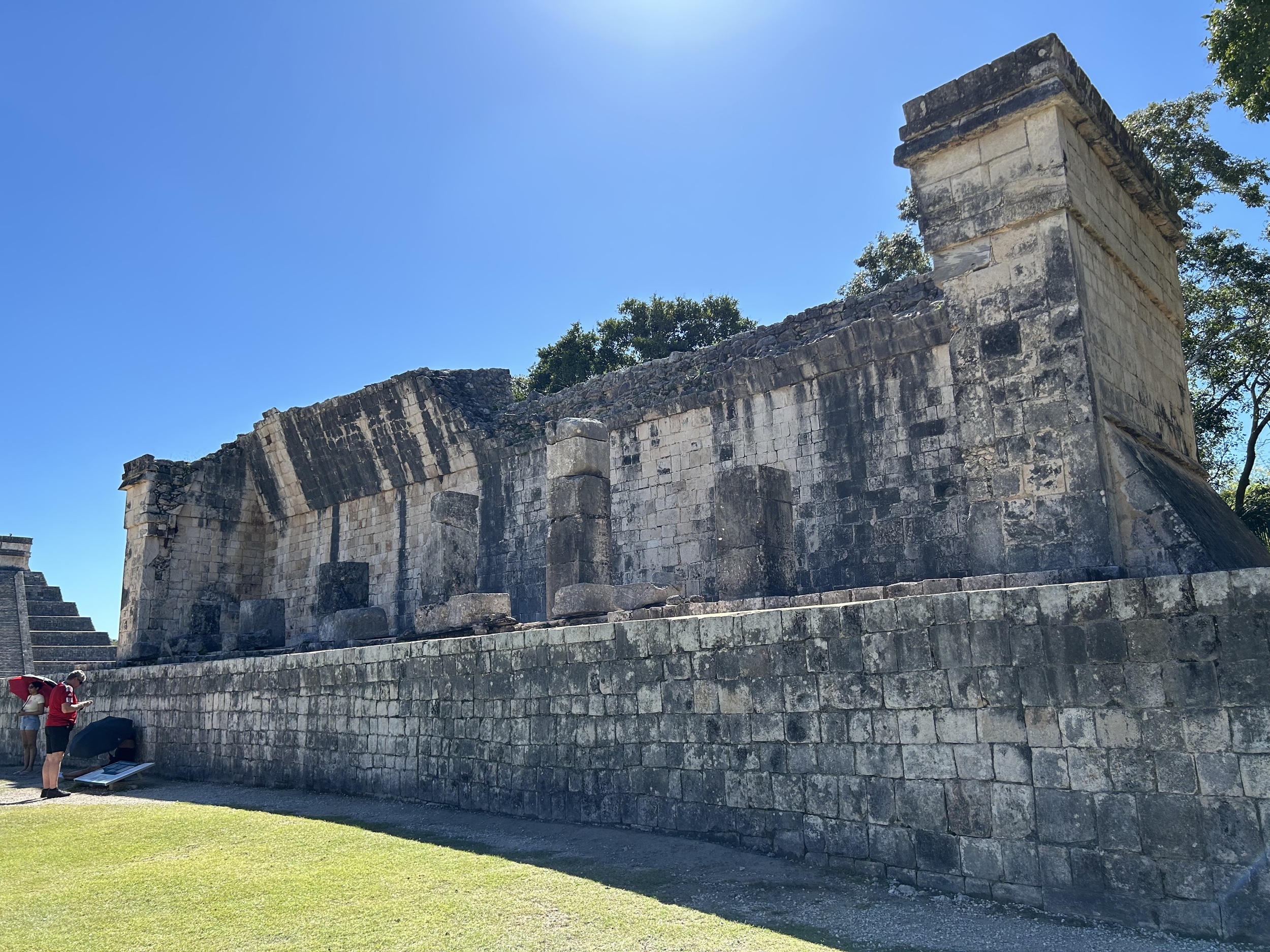 Obok rozciąga się rozległy Dziedziniec Tysiąca Kolumn (Grupo de las Mil Columnas) – las kamiennych filarów, które pierwotnie podtrzymywały lekkie zadaszenia z drewna i palmowych liści. Kolumny były rozmieszczone w regularnych modułach, co umożliwiało elastyczne kształtowanie przestrzeni w zależności od charakteru zgromadzeń i ceremonii. Przestrzeń nie była świątynią w ścisłym sensie, lecz wielofunkcyjnym centrum ceremonialno-publicznym: miejscem zgromadzeń, rytuałów, parad wojskowych oraz kontroli dostępu do najważniejszych stref sakralnych. Regularny rytm kolumn, ich masywność i skala dziedzińca podkreślają zbiorowy, niemal „instytucjonalny” charakter władzy w Chichén Itzá. To architektura podporządkowana nie jednostce, lecz strukturze — elicie wojowników i kapłanów, działających w imieniu porządku kosmicznego i politycznego. Dziedziniec stanowi czytelny kontrast wobec wcześniejszych, bardziej kameralnych przestrzeni klasycznych miast Majów, pokazując kierunek ewolucji miasta ku formie quasi-imperialnej.