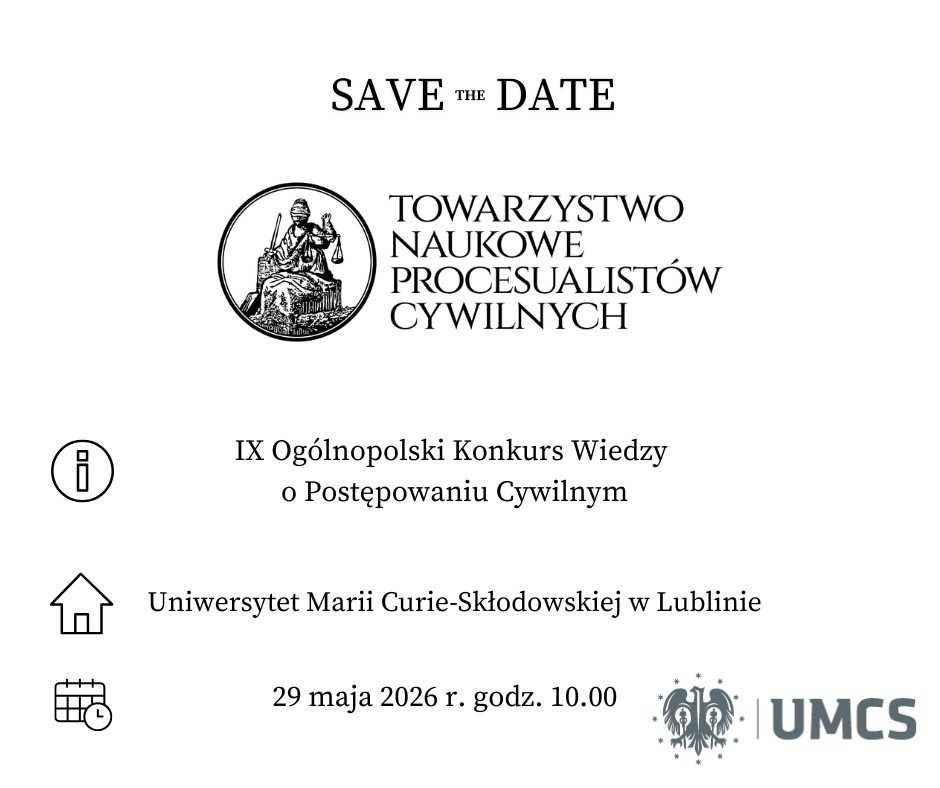 Ogłoszono IX edycję Konkursu Wiedzy o Postępowaniu Cywilnym (2026), którego finał odbędzie się 29 maja (piątek) na Wydziale Prawa i Administracji Uniwersytetu Marii Curie-Skłodowskiej w Lublinie.