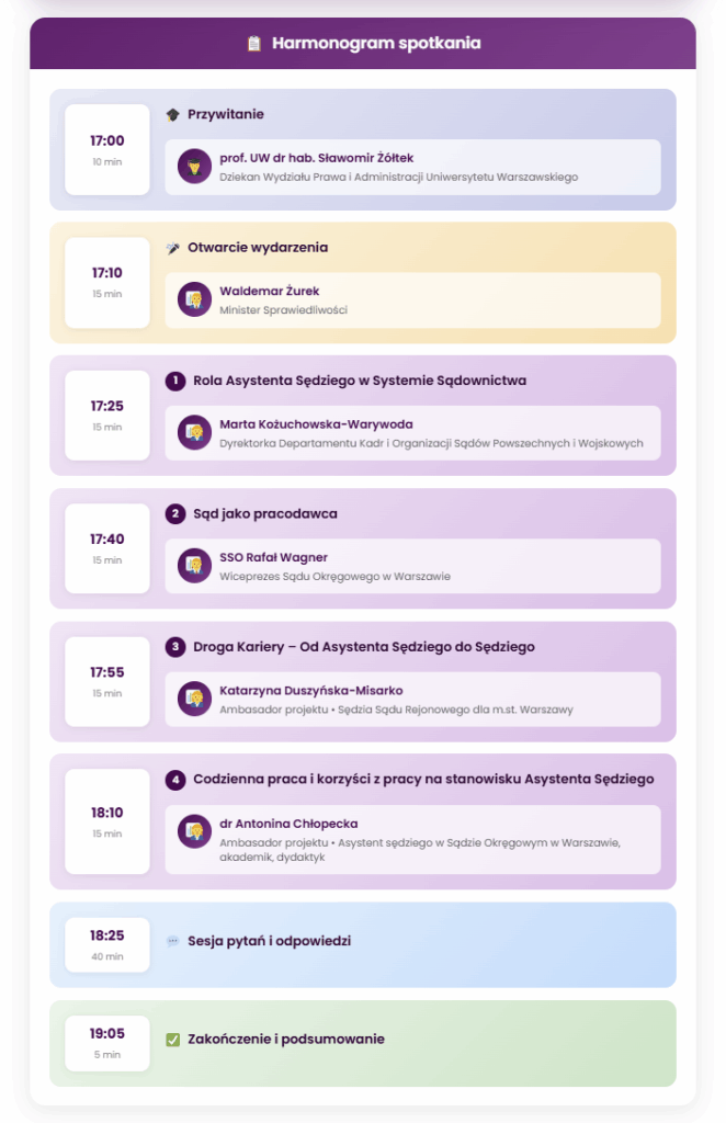 Ministerstwo Sprawiedliwości we współpracy z Wydziałem Prawa i Administracji Uniwersytetu Warszawskiego oraz z Kołem Naukowym Zawodów Prawniczych UW zapraszają na organizowane w ramach projektu „Asystent Sędziego – Prawo. Praktyka. Przyszłość” spotkanie na Uniwersytecie Warszawskim, które odbędzie się w 16 grudnia 2025 r. (wtorek) w godz. 17:00 – 19:00 w auli Starej Biblioteki Uniwersytetu Warszawskiego, Kampus Główny UW przy ul. Krakowskie Przedmieście 26/28 w Warszawie.