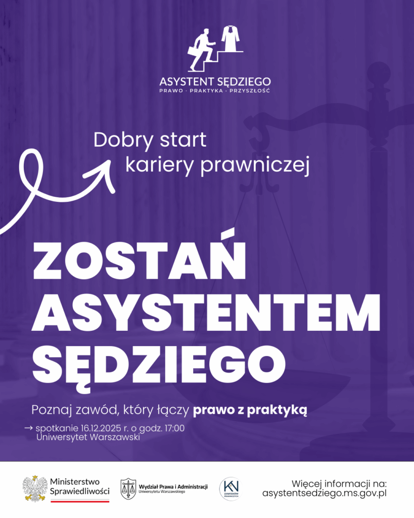 Ministerstwo Sprawiedliwości we współpracy z Wydziałem Prawa i Administracji Uniwersytetu Warszawskiego oraz z Kołem Naukowym Zawodów Prawniczych UW zapraszają na organizowane w ramach projektu „Asystent Sędziego – Prawo. Praktyka. Przyszłość” spotkanie na Uniwersytecie Warszawskim, które odbędzie się w 16 grudnia 2025 r. (wtorek) w godz. 17:00 – 19:00 w auli Starej Biblioteki Uniwersytetu Warszawskiego, Kampus Główny UW przy ul. Krakowskie Przedmieście 26/28 w Warszawie.