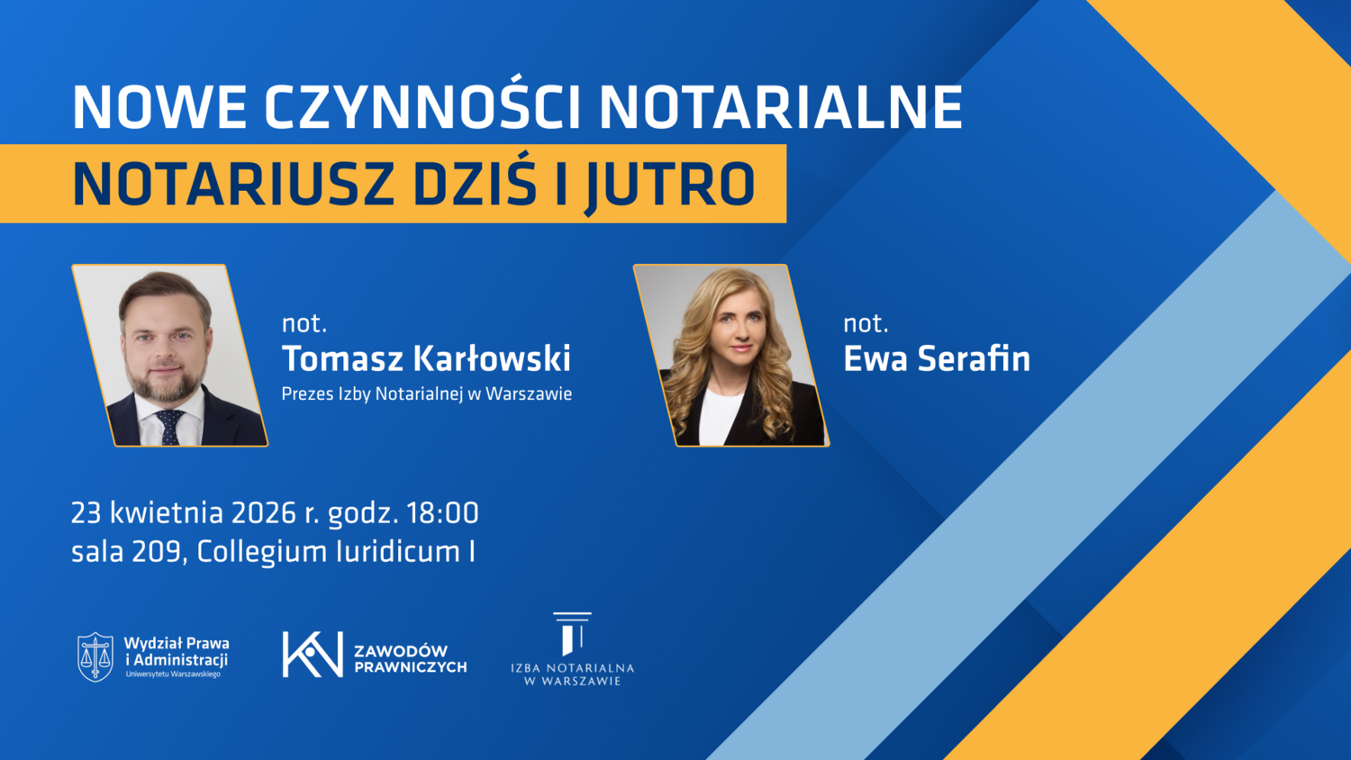 Wydział Prawa i Administracji Uniwersytetu Warszawskiego wraz z Kołem Naukowym Zawodów Prawniczych WPiA UW, realizując porozumienie o współpracy z Izbą Notarialną w Warszawie, zaprasza w dniu 23 kwietnia 2026 r. (czwartek) o godz. 18:00 na spotkanie pt. „Nowe czynności notarialne. Notariusz dziś i jutro„ – sala 209, Collegium Iuridicum I (tzw. Stary Wydział).
