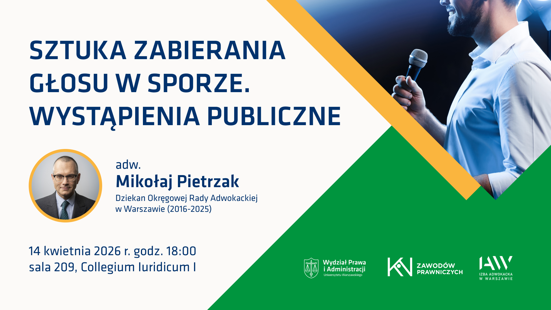 Wydział Prawa i Administracji Uniwersytetu Warszawskiego wraz z Kołem Naukowym Zawodów Prawniczych WPiA UW, realizując porozumienie o współpracy z Izbą Adwokacką w Warszawie, zaprasza w dniu 14 kwietnia 2026 r. (wtorek) o godz. 18:00 na spotkanie pt. „Sztuka zabierania głosu w sporze. Wystąpienia publiczne„ – sala 209, Collegium Iuridicum I (tzw. Stary Wydział).