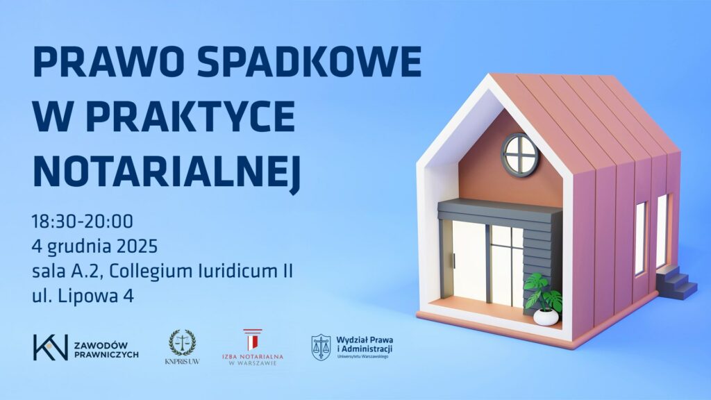Koło Naukowe Zawodów Prawniczych oraz Koło Naukowe Prawa Rodzinnego i Spadkowego WPiA UW, realizując porozumienie o współpracy Wydziału Prawa i Administracji Uniwersytetu Warszawskiego z Izbą Notarialną w Warszawie, zapraszają na prowadzony przez przedstawicieli samorządu zawodowego cykl warsztatów pt. Prawo spadkowe w praktyce notarialnej, warsztaty z prawa spadkowego. Udział w wydarzeniu jest doskonałą okazją do poszerzenia wiedzy z zakresu prawa spadkowego, poznania tajników zawodu notariusza oraz powtórzenia materiału przed egzaminem z prawa rodzinnego i spadkowego.