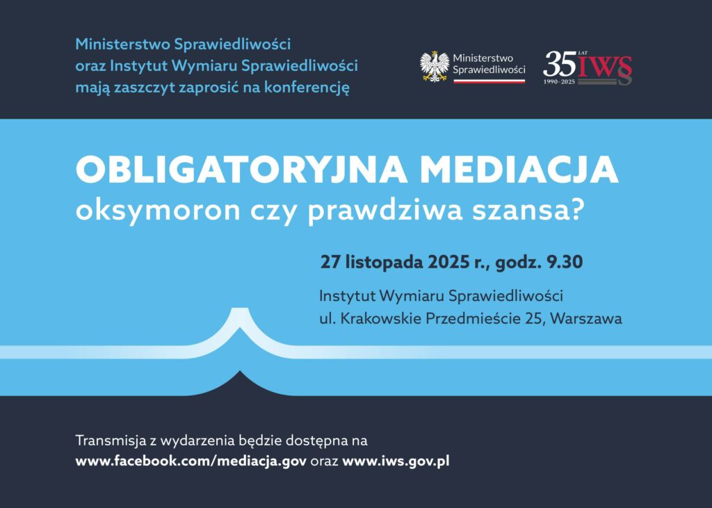 Konferencja naukowa pt. Obligatoryjna mediacja – oksymoron czy prawdziwa szansa? organizowana przez Ministerstwo Sprawiedliwości oraz Instytut Wymiaru Sprawiedliwości odbędzie się 27 listopada 2025 r. (czwartek) w godz. 9:30 – 16:00 w siedzibie IWS przy ul. Krakowskie Przedmieście 25 w Warszawie. Wydarzenie będzie miało charakter hybrydowy.