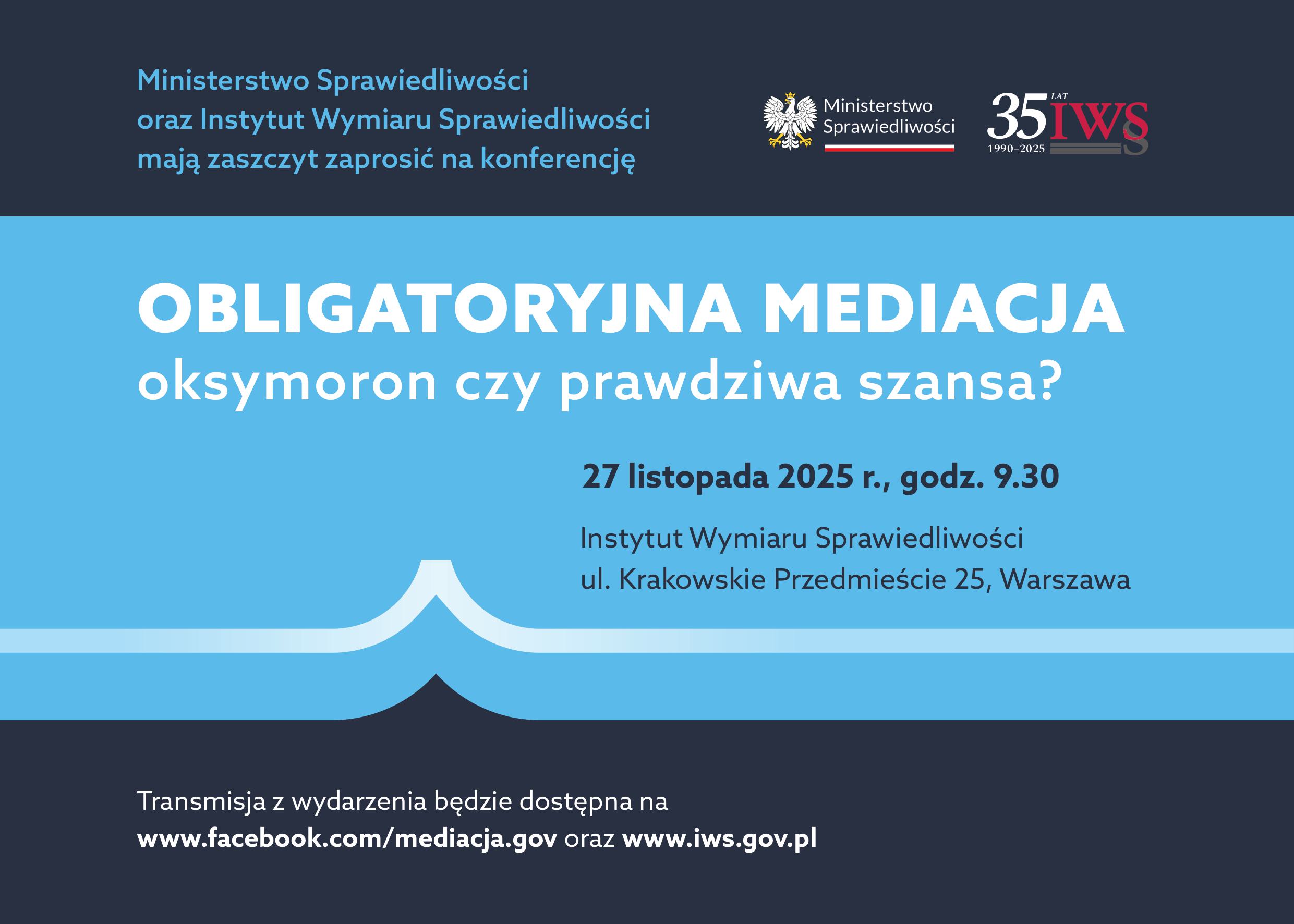 Konferencja naukowa pt. Obligatoryjna mediacja – oksymoron czy prawdziwa szansa? organizowana przez Ministerstwo Sprawiedliwości oraz Instytut Wymiaru Sprawiedliwości odbędzie się 27 listopada 2025 r. (czwartek) w godz. 9:30 – 16:00 w siedzibie IWS przy ul. Krakowskie Przedmieście 25 w Warszawie. Wydarzenie będzie miało charakter hybrydowy.