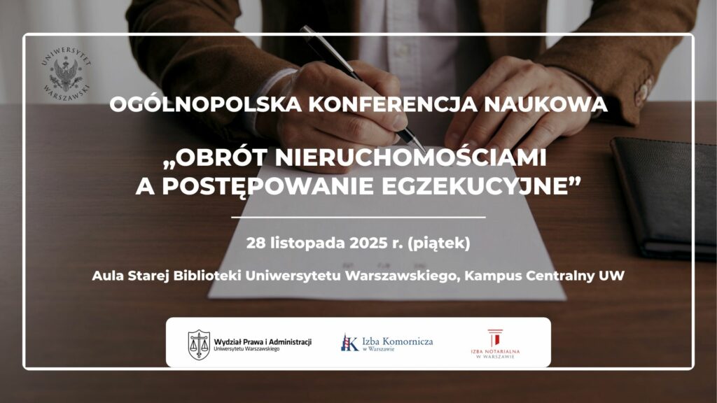 Ogólnopolska konferencja naukowa pt. „Obrót nieruchomościami a postępowanie egzekucyjne” organizowana przez Wydział Prawa i Administracji Uniwersytetu Warszawskiego, Izbę Komorniczą w Warszawie oraz Izbę Notarialną w Warszawie odbędzie się 28 listopada 2025 r. (piątek) w godz. 9:30 – 16:00, aula Starej Biblioteki Uniwersytetu Warszawskiego, Kampus Główny UW przy ul. Krakowskie Przedmieście 26/28 w Warszawie.