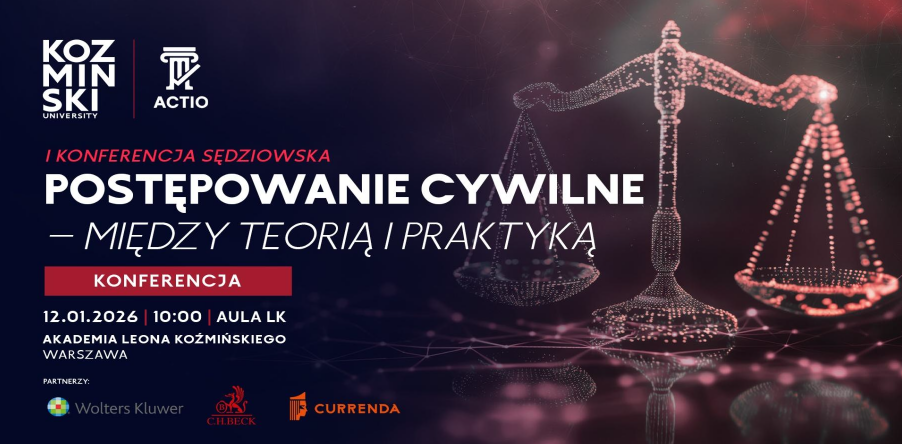 Ogólnopolska konferencja naukowa pt. „Postępowanie cywilne – między teorią i praktyką” organizowana przez Akademię Leona Koźmińskiego w Warszawie odbędzie się 12 stycznia 2026 r. (poniedziałek) w godz. 10:00 – 15:00 w siedzibie ALK przy ul. Jagiellońskiej 59 w Warszawie, Aula AK w budynku C.