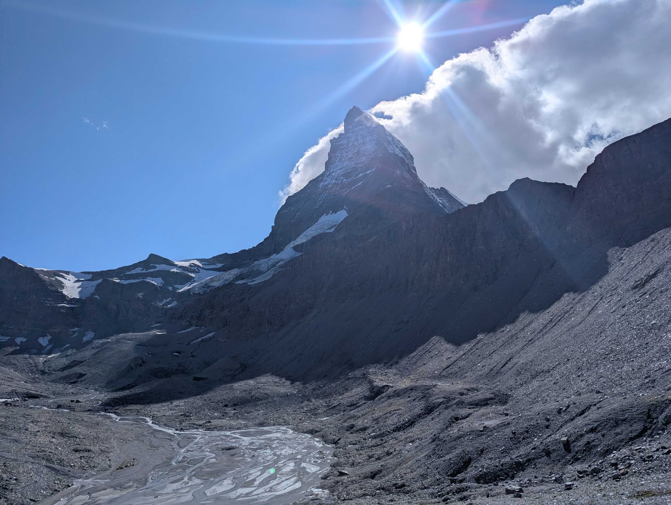 Wszystkie drogi – zamiast do Rzymu – wiodą pod tytułowy Matterhorn (4478 m), którego piramidalny kształt powstał w wyniku intensywnej erozji lodowcowej, która przez tysiące lat rzeźbiła ściany i żleby, odsłaniając twarde skały krystaliczne. Szczyt zbudowany z gnejsów i amfibolitów – skał należących pierwotnie do płyty afrykańskiej, wypchniętej podczas kolizji z kontynentem europejskim.  Miększe skały zostały usunięte przez lodowce, a przetrwał jedynie najtwardszy krystaliczny trzon. W pewnym sensie Matterhorn jest więc afrykańskim fragmentem krajobrazu osadzonym w sercu Szwajcarii.
