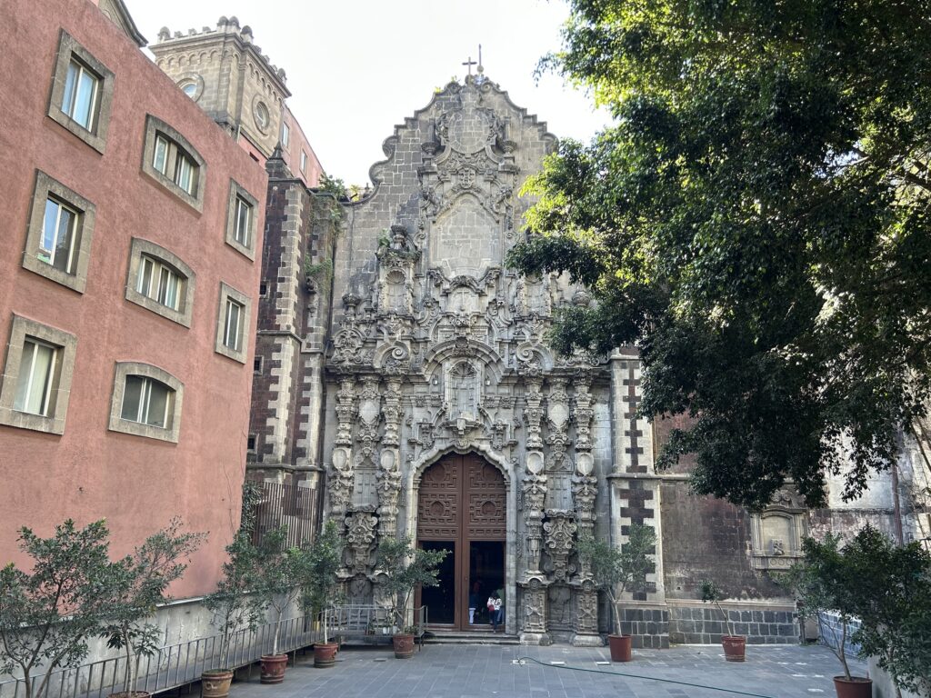 Sagrario Metropolitano, zewnętrzna kaplica boczna to formalnie oddzielna budowla, przylegająca do katedry od północnej strony. Powstała w XVIII w. i jest jednym z najczystszych przykładów meksykańskiego baroku churrigueryjskiego w architekturze zewnętrznej. Barok komunikacyjny był skierowany do wiernych, miał przyciągać, porządkować i nauczać.