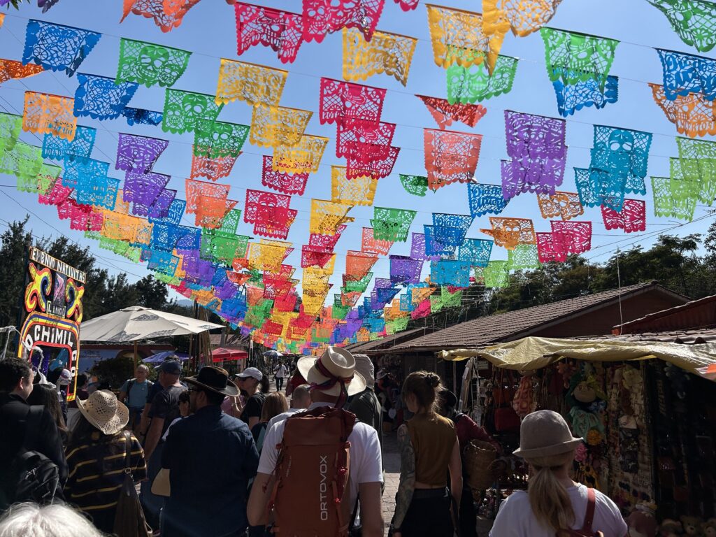 Integralnym elementem Xochimilco pozostaje lokalny targ. Sprzedawane produkty – w tym warzywa z chinampas, zioła, kukurydza, słodycze – pokazują ciągłość prekolumbijskich wzorców żywieniowych, uzupełnionych o wpływy kolonialne. Plus współczesna tandeta a la Zakopane. Rytuał, rekreacja i handel wzajemnie się uzupełniają.