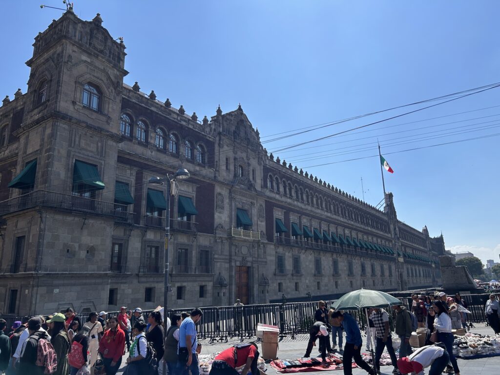 Pałac Narodowy (Palacio Nacional) to palimpsest władzy usytuowany w miejscu, które było siedzibą Moctezumy II, tlatoaniego imperium Azteków. Po zdobyciu Tenochtitlánu Hernán Cortés przejął teren i wzniósł rezydencję, lokując ją w samym sercu dawnego imperium rodowitych mieszkańców. Rozciągnięta, horyzontalna fasada o długości blisko 200 metrów podkreśla monumentalność i trwałość instytucji państwa. Dawniej pełnił funkcję oficjalnej rezydencji prezydentów Meksyku, dziś mieści m.in. Ministerstwo Finansów oraz archiwa państwowe.