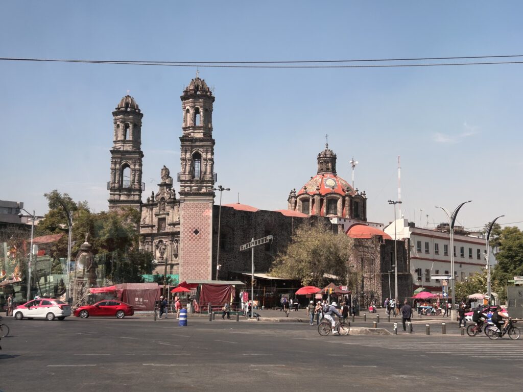 Kościół św. Jakuba Apostoła w Tlatelolco (Templo de Santiago Tlatelolco), wzniesiony w XVI w. przez Hiszpanów, dominuje nad otaczającą przestrzenią jako wyraźny znak kolonialnej władzy religijnej. Jego surowa, kamienna bryła została celowo posadowiona na terenie dawnego centrum miasta Tlatelolco, jednego z najważniejszych ośrodków azteckich i miejsca ostatnich walk w 1521 r. Bezpośrednio przed kościołem rozciągają się ruiny prekolumbijskiej zabudowy, pozostałości miasta, które po upadku imperium Azteków zostało fizycznie zniszczone i podporządkowane nowemu porządkowi.