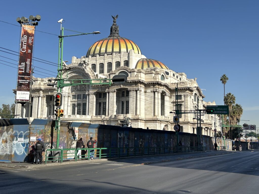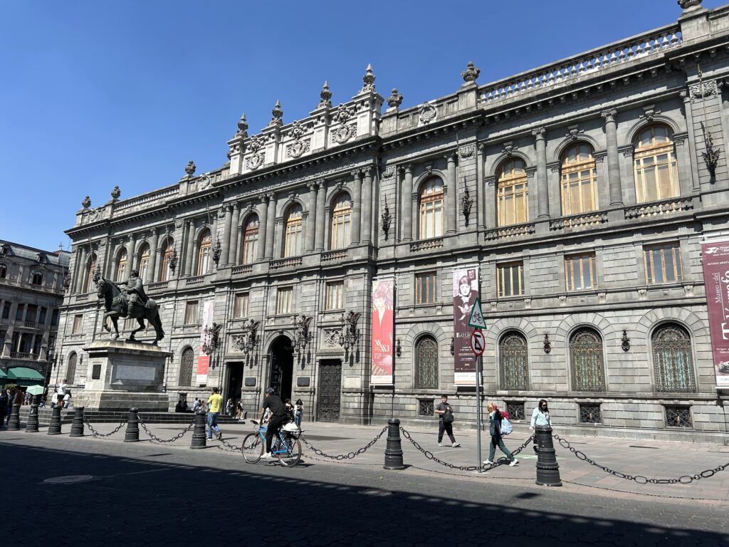 Palacio de Bellas Artes (Pałac Sztuk Pięknych) to najważniejszy gmach kultury wysokiej w Meksyku. Budowę rozpoczęto w 1904 r. w epoce porfiriańskiej, z myślą o reprezentacyjnym teatrze narodowym, lecz prace przeciągnęły się z powodu rewolucji meksykańskiej i problemów technicznych wynikających z niestabilnego, jeziornego podłoża miasta. Ukończony dopiero w 1934 r., budynek łączy zewnętrzny neoklasycyzm (inspirowany architekturą europejską) z wnętrzami art déco. Jest jednym z kluczowych miejsc meksykańskiego muralizmu – prace m.in. Diego Rivery, José Clemente Orozco i Davida Alfara Siqueirosa.