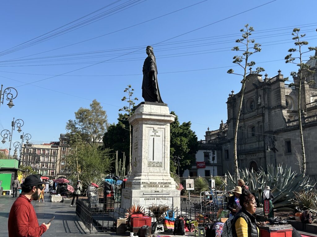 Usytuowany przy centralnym placu pomnik Enrico Martíneza (Monumento de Enrico Martínez) upamiętnia XVII-wiecznego inżyniera, kartografa i kosmografa Nowej Hiszpanii, jednego z promotorów kolonialnych projektów odwadniania Kotliny Meksykańskiej. Symbolizuje fundamentalny zwrot cywilizacyjny: przejście od azteckiego modelu adaptacji do środowiska (miasto-wyspa, kanały, chinampy) do kolonialnego modelu walki z naturą poprzez osuszanie, prostowanie i odprowadzanie wód poza kotlinę. Decyzja o stopniowym osuszaniu jezior Kotliny Meksykańskiej – rozpoczęta w epoce kolonialnej i kontynuowana w XIX–XX w. – umożliwiła ekspansję urbanistyczną, ale jednocześnie stworzyła trwałe problemy strukturalne CDMX.