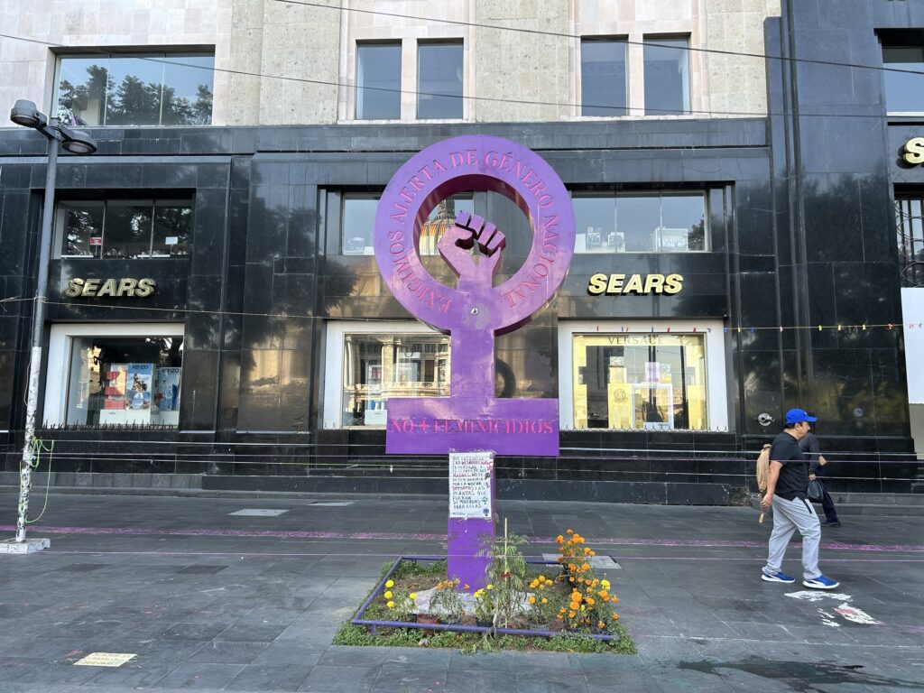 W Alamedzie nie zabrakło wreszcie miejsca na symbol walki z przemocą wobec kobiet. Według danych krajowych instytucji statystycznych ponad 70% kobiet i dziewcząt w wieku powyżej 15 lat doświadcza w Meksyku przemocy (psychicznej, fizycznej, seksualnej lub ekonomicznej). Skrajna forma tej przemocy – femicidio, czyli zabójstwo kobiety z powodu jej płci – również osiąga alarmujące liczby. W Meksyku rocznie notuje się tysiące takich przypadków, co przekłada się na średnio około 10 zabitych kobiet i dziewcząt dziennie.