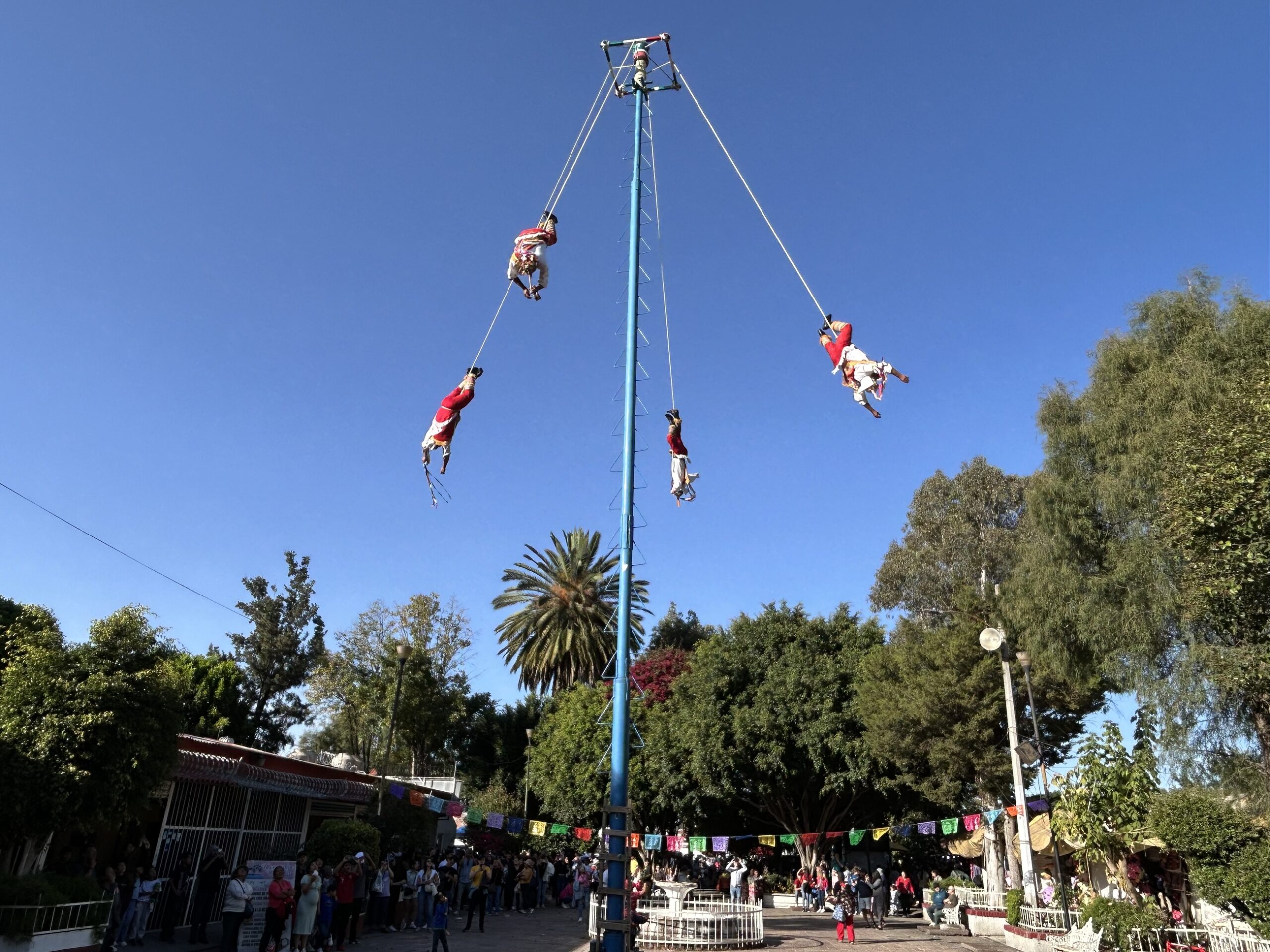 Dodatkową atrakcją jest Voladores de Papantla – rytuał wywodzący się z kultur Totonaków i Nahua, uznany przez UNESCO za niematerialne dziedzictwo ludzkości. Czterech „latających” wykonawców, związanych linami, wiruje wokół wysokiego pala, symbolizując kosmiczny porządek, cykle czasu i relację człowieka z naturą; piąty, pozostający na szczycie, gra na flecie i bębnie. A szósty zbiera datki od obserwujących.