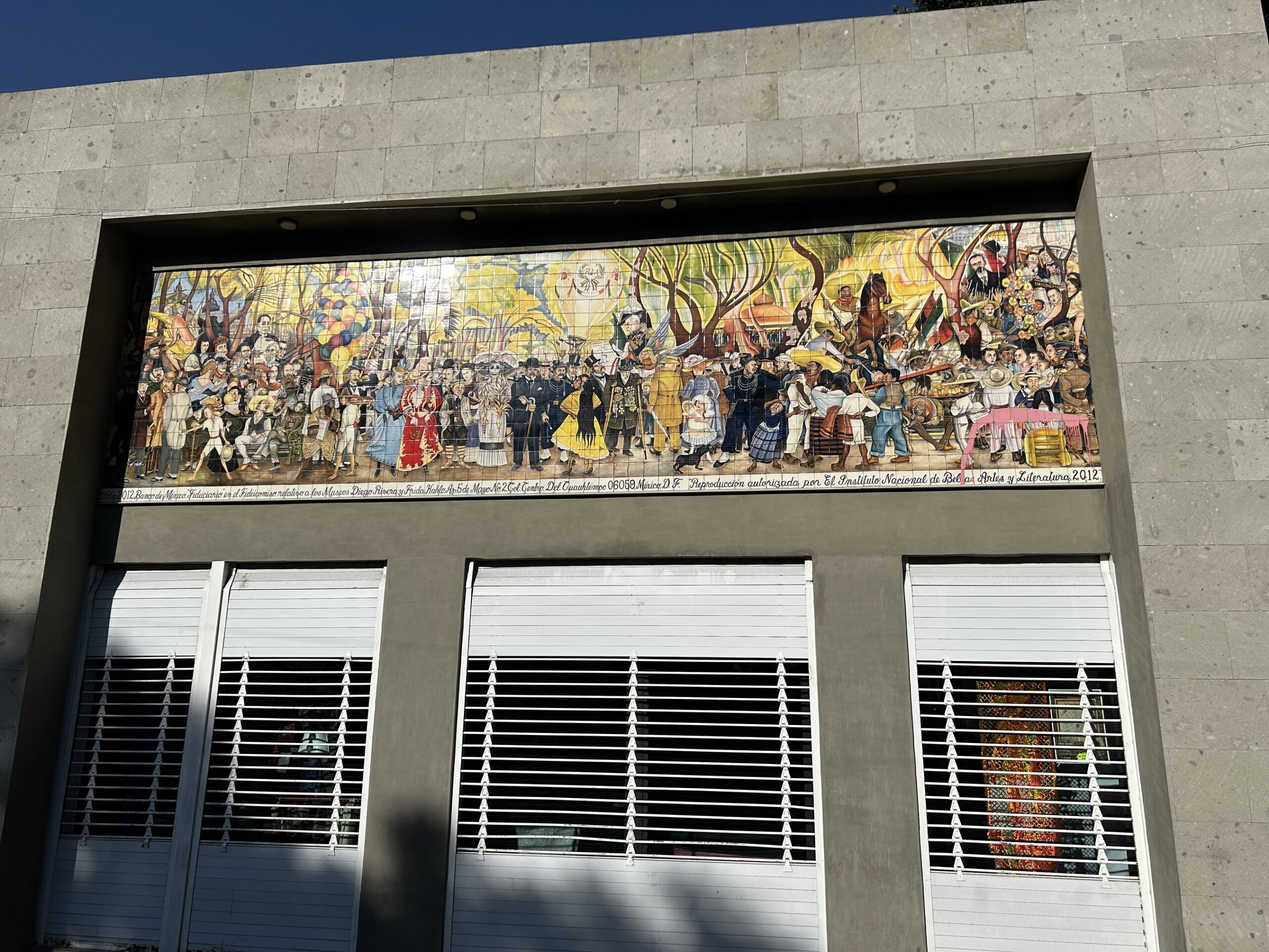 Murale Diego Rivery są także eksponowane w przestrzeni miejskiej. Sueño de una tarde dominical en la Alameda Central przedstawua panoramę dziejów Meksyku jako scenę rozgrywającą się w parku – łączy postacie z epoki prekolumbijskiej, kolonialnej i nowoczesnej, zestawiając bohaterów narodowych z anonimowymi mieszkańcami miasta.