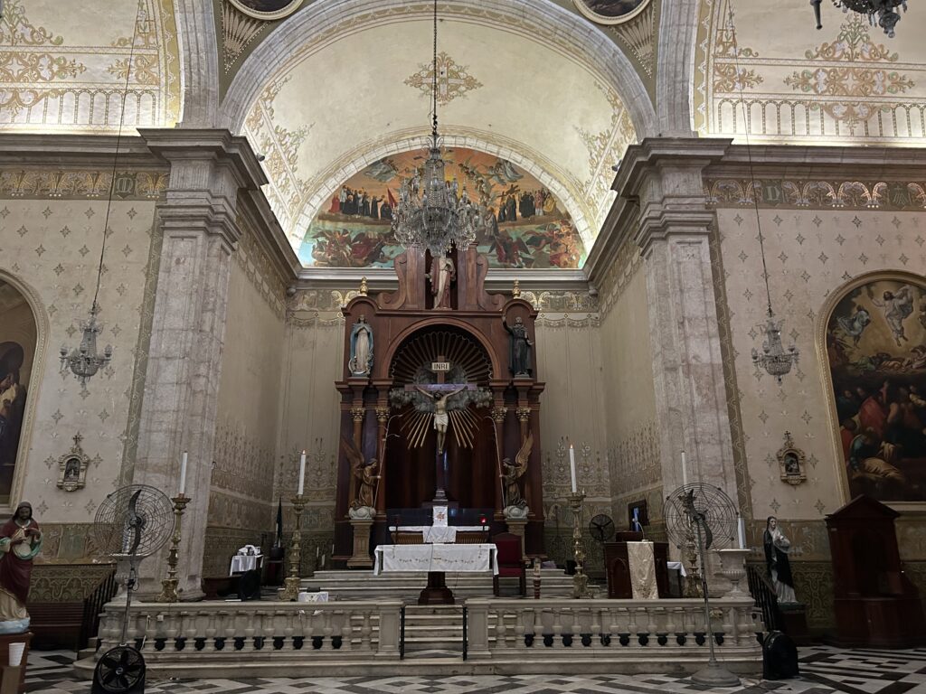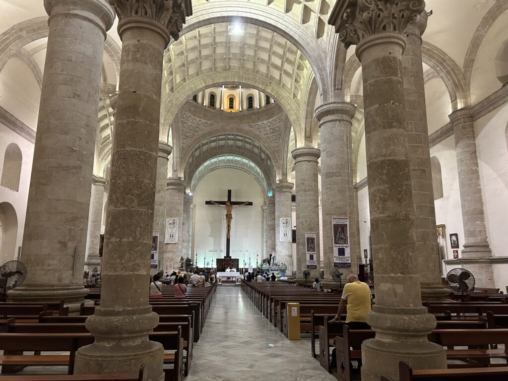 Wnętrze katedry jest oszczędne, pozbawione nadmiaru dekoracji. Dominują potężne cylindryczne filary, szerokie arkady i sklepienia kolebkowe. Katedra była świadkiem dramatycznych epizodów historii regionu, w tym niszczenia kodeksów Majów w XVI wieku oraz napięć społecznych i religijnych kolejnych stuleci.