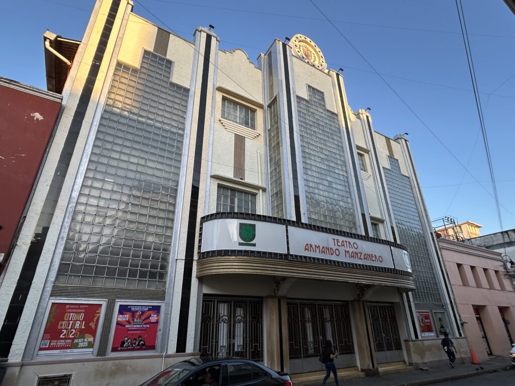 Teatro Armando Manzanero Teatr nosi imię jednego z najsłynniejszych kompozytorów Meksyku, urodzonego w Méridzie twórcy boler i piosenek romantycznych, znanych w całej Ameryce Łacińskiej. Budynek jest charakterystycznym przykładem architektury art déco w Méridzie. Wertykalne podziały, gładkie płaszczyzny, rytm pionowych lizen oraz duże powierzchnie szkła luksferowego, które pierwotnie miały zapewniać efekt świetlny i nowoczesny charakter budynku. Zaokrąglony daszek nad wejściem (markiza) i symetryczna kompozycja fasady jednoznacznie odwołują się do estetyki kin miejskich pierwszej połowy XX wieku.