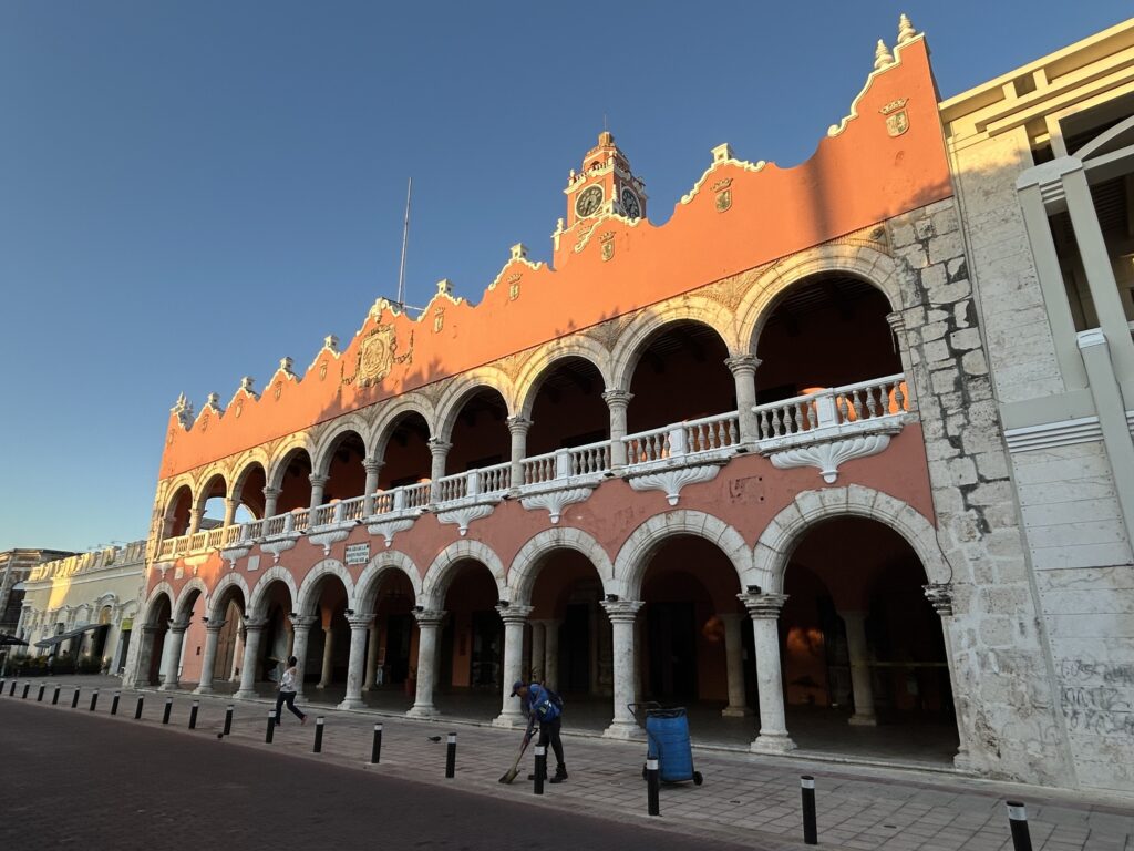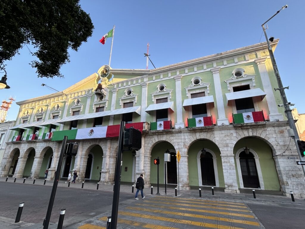 Palacio Municipal de Mérida, siedziba władz miejskich, wzniesiona została w latach 1734–1736 jako obiekt o funkcjach użytkowych, związanych z administracją miejską i zapleczem gospodarczym miasta kolonialnego. Dwukondygnacyjna, arkadowa fasada z wieżą zegarową jest efektem przekształceń z przełomu XIX i XX wieku, kiedy Mérida przeżywała intensywny rozwój związany z handlem włóknem henequenowym (Agave fourcroydes). Dochody płynące z „zielonego złota Jukatanu” – vide Sotuta de Peón – umożliwiły nadanie ratuszowi bardziej reprezentacyjnego charakteru i dostosowanie go do ambicji miasta aspirującego do roli nowoczesnej stolicy regionalnej.