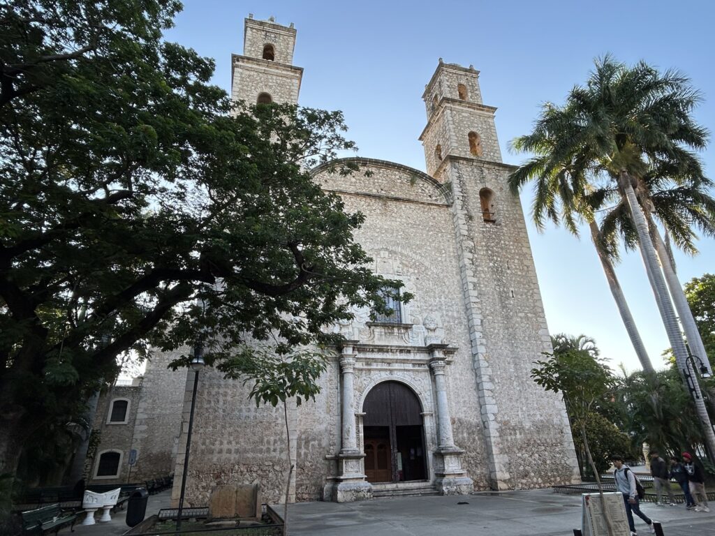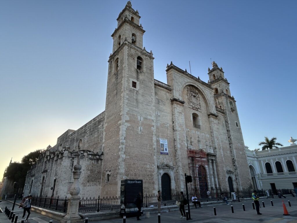 Catedral de San Ildefonso (Katedra św. Ildefonsa z Toledo) jest najstarszą katedrą w kontynentalnej Ameryce, wznoszoną w latach 1561–1598. Powstała bezpośrednio po podboju Jukatanu, na miejscu dawnej majańskiej zabudowy, z wykorzystaniem kamienia rozbiórkowego ze świątyń miasta T’hó. Zewnętrzna bryła katedry jest surowa i masywna, pozbawiona barokowej dekoracyjności typowej dla późniejszych świątyń Meksyku. Dwie masywne wieże i ciężkie mury z wapienia jukatańskiego nadają całości niemal forteczny charakter.